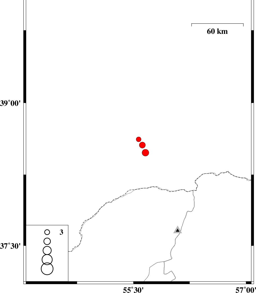 | 2012/09/09 | 16:37:10.9 | 21:07:10.9 | 37.19 | 54.16 | 16 | ML:2.9 | Golestan Province, 33 km North of Bandar-e torkaman | ||