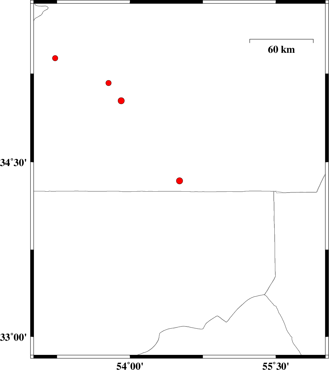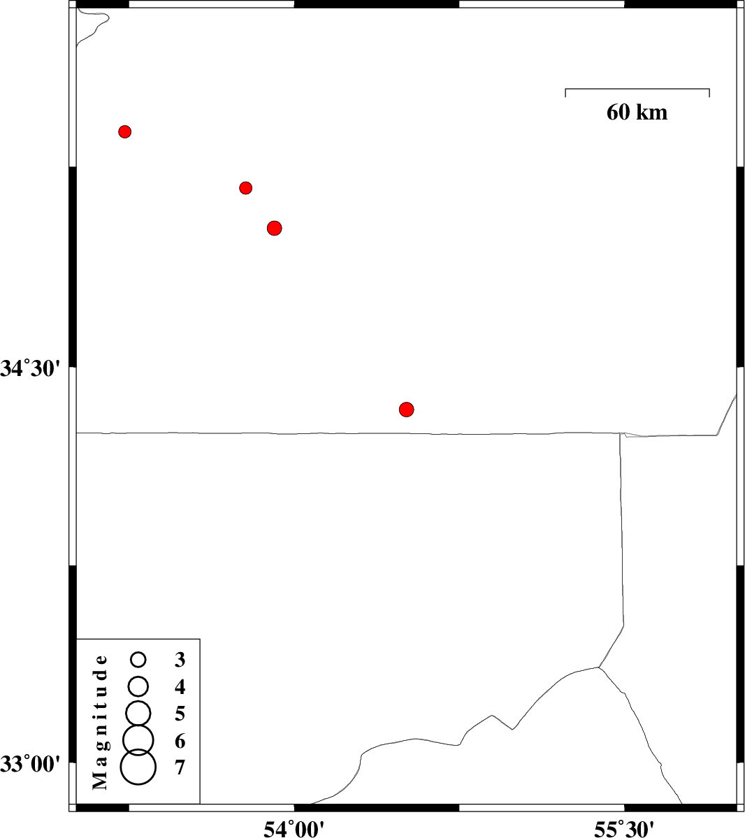 | 2012/09/12 | 10:19:48.7 | 14:49:48.7 | 34.34 | 54.51 | 16 | ML:2.9 | Semnan Province, 204 km South-East of Damghan | ||