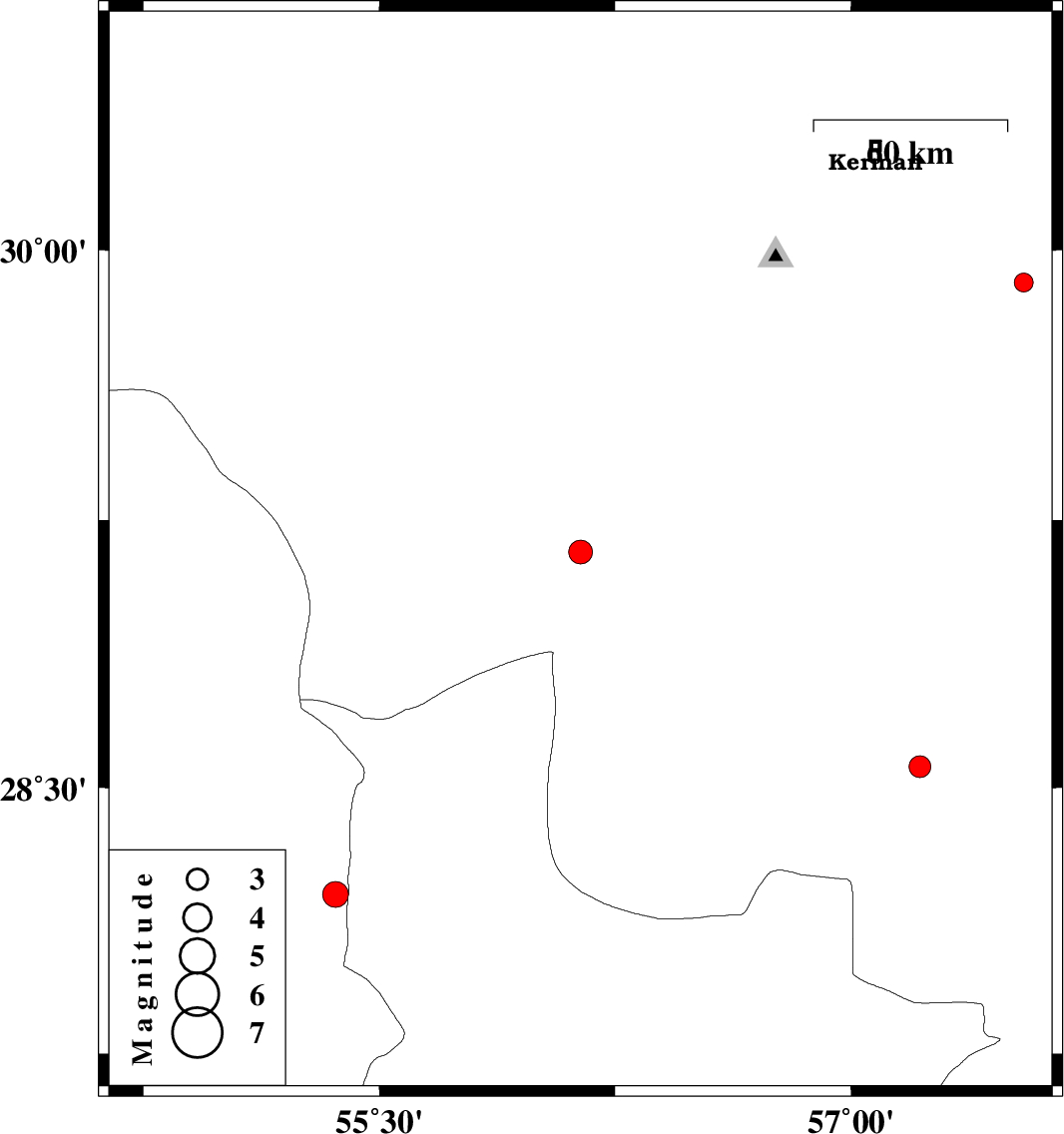 | 2012/09/03 | 20:01:52.0 | 00:31:52.0 | 29.91 | 57.55 | 14 | ML:2.7 | Kerman Province, 62 km South-East of Kerman | ||