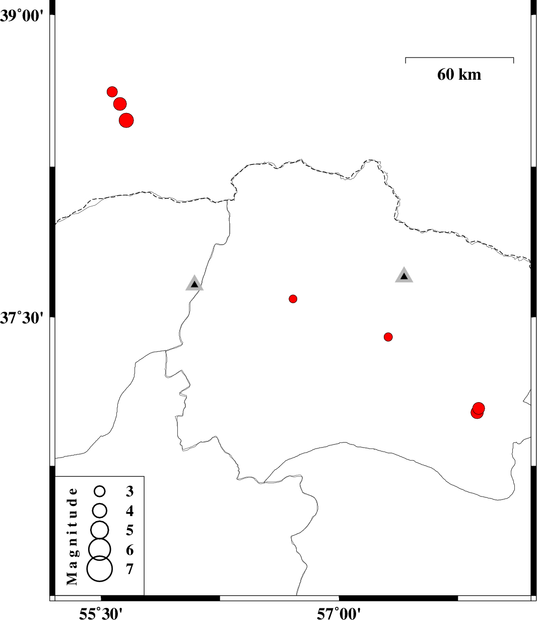 | 2012/08/25 | 06:32:17.9 | 11:02:17.9 | 37.02 | 57.87 | 6 | ML:3.5 | Khorasan(north) Province, 33 km East of Esfarayen | ||