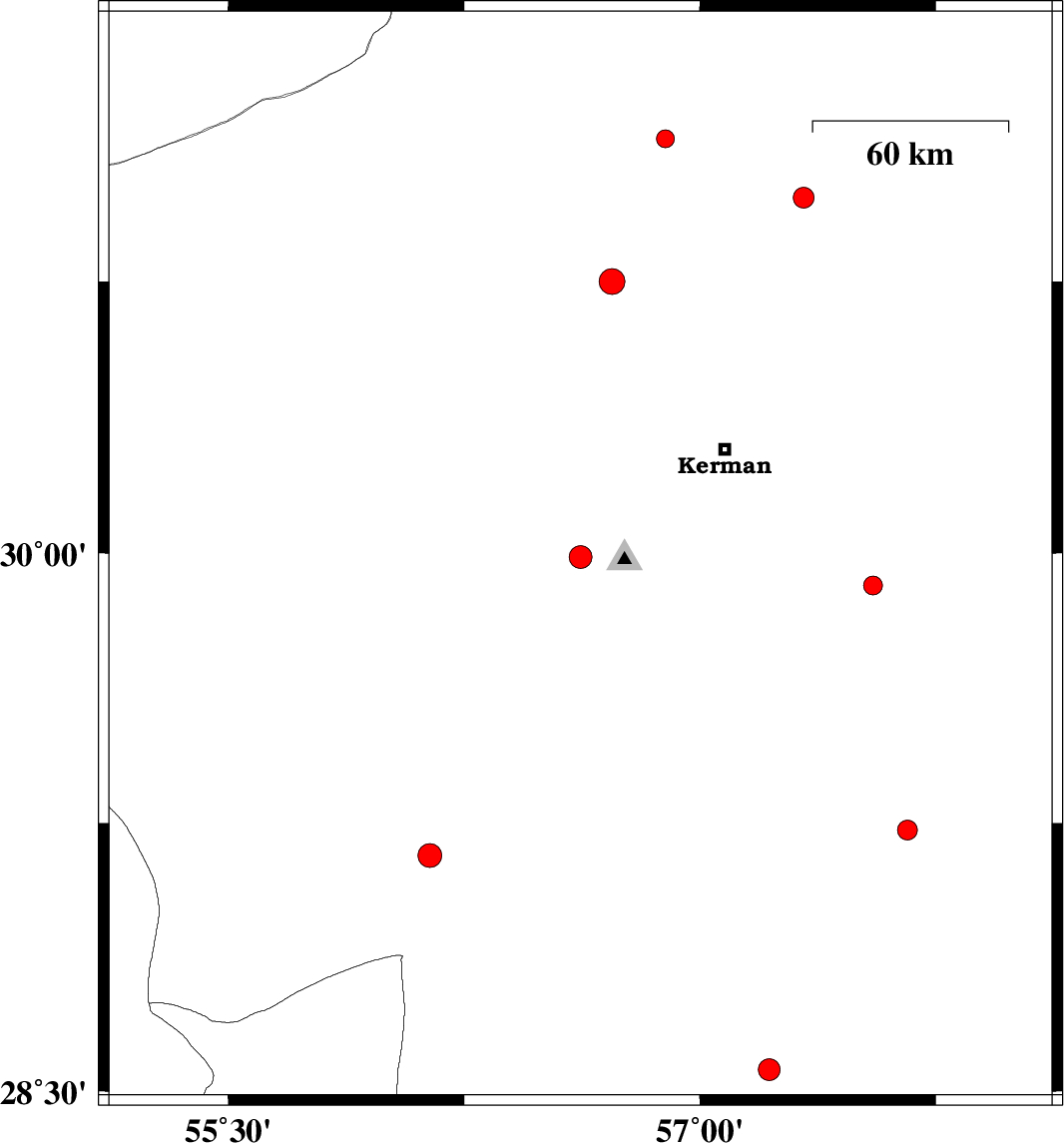| 2012/08/18 | 14:46:32.0 | 19:16:32.0 | 28.56 | 57.22 | 35 | ML:3.1 | Kerman Province, 52 km South-West of Jiroft |