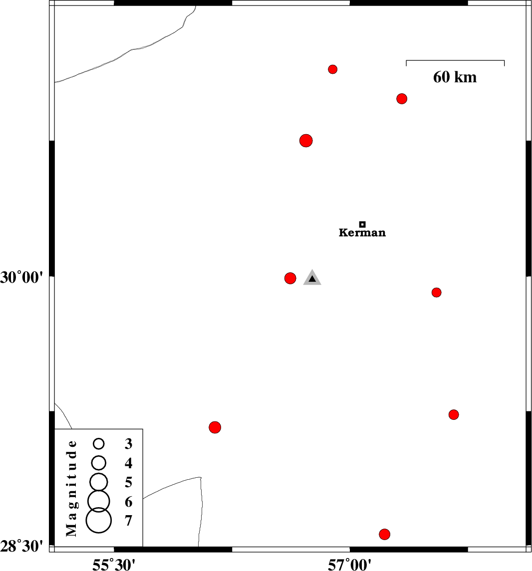 | 2012/09/03 | 20:01:52.0 | 00:31:52.0 | 29.91 | 57.55 | 14 | ML:2.7 | Kerman Province, 62 km South-East of Kerman | ||