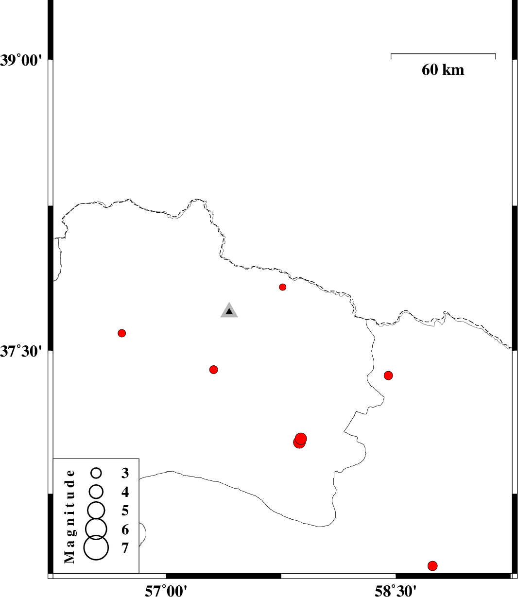 | 2012/09/17 | 04:26:55.8 | 08:56:55.8 | 37.83 | 57.76 | 6 | ML:2 | Khorasan(north) Province, 52 km North-West of Shirvan | ||