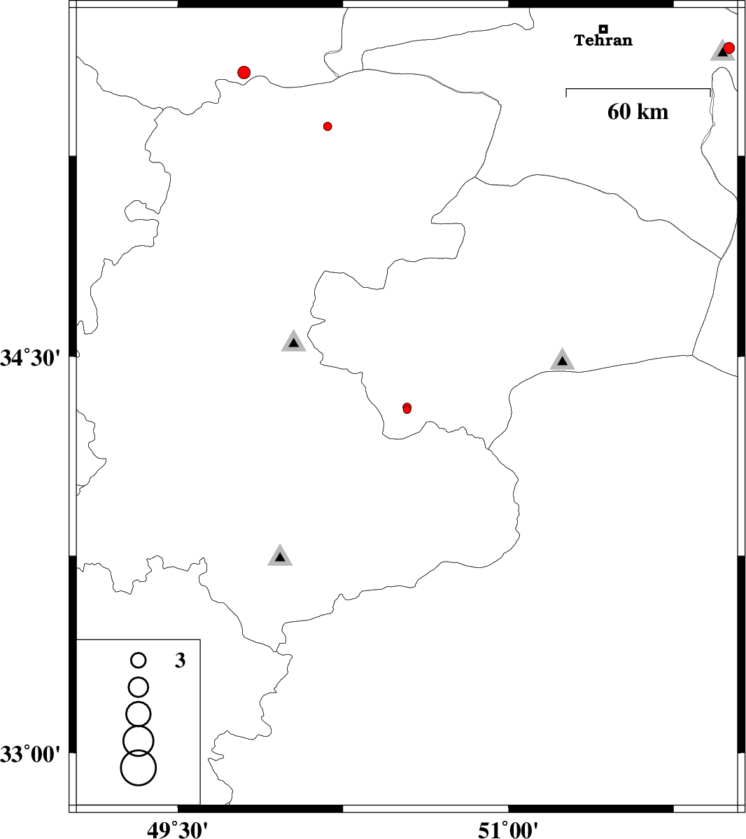 | 2012/09/10 | 04:49:36.9 | 09:19:36.9 | 34.31 | 50.54 | 14 | ML:1.7 | Qom Province, 37 km North-West of Delijan |