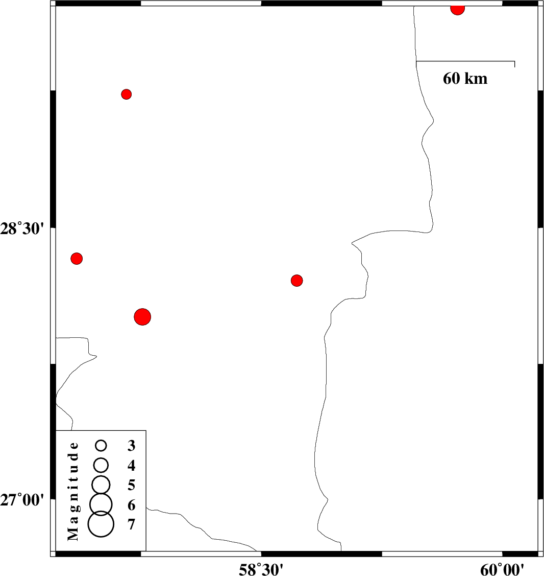 | 2012/09/19 | 22:09:12.6 | 02:39:12.6 | 28.21 | 58.72 | 18 | ML:3.2 | Kerman Province, 106 km South-East of Bam | ||