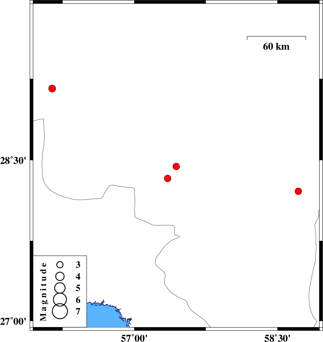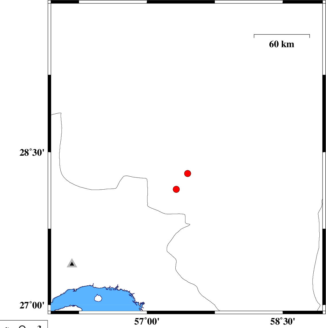 | 2012/09/19 | 22:09:12.6 | 02:39:12.6 | 28.21 | 58.72 | 18 | ML:3.2 | Kerman Province, 106 km South-East of Bam | ||