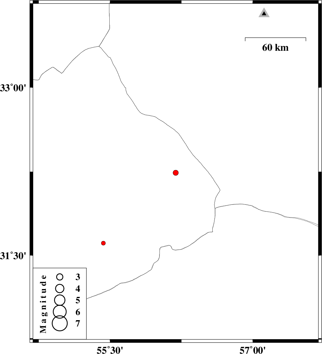 | 2012/09/21 | 11:51:09.4 | 15:21:09.4 | 31.61 | 55.43 | 22 | ML:2 | Yazd Province, 3 km Bafq | ||