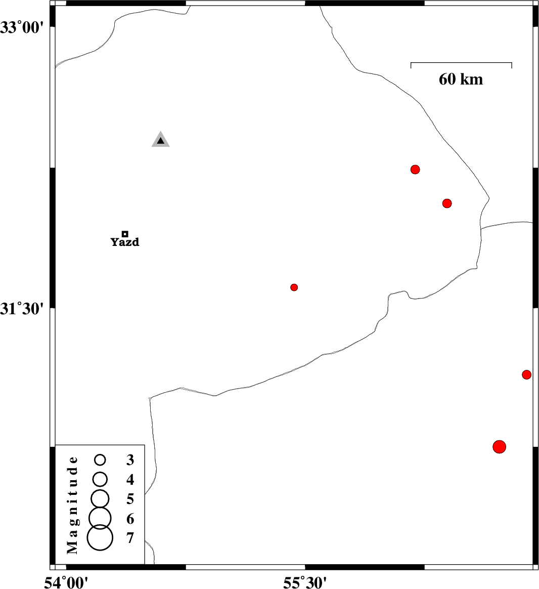| 2012/09/21 | 11:51:09.4 | 15:21:09.4 | 31.61 | 55.43 | 22 | ML:2 | Yazd Province, 3 km Bafq | ||