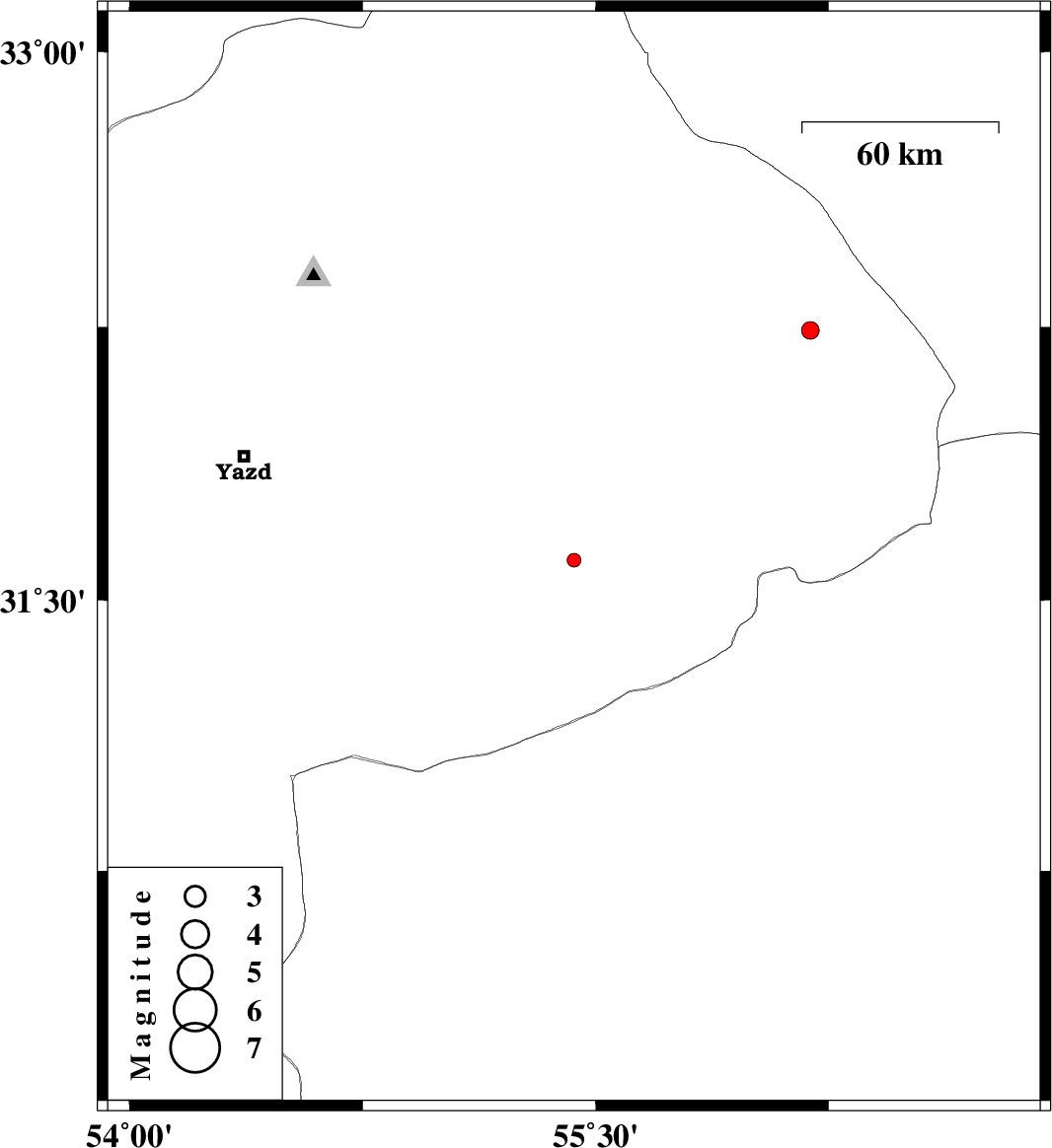 | 2012/09/21 | 11:51:09.4 | 15:21:09.4 | 31.61 | 55.43 | 22 | ML:2 | Yazd Province, 3 km Bafq | ||
