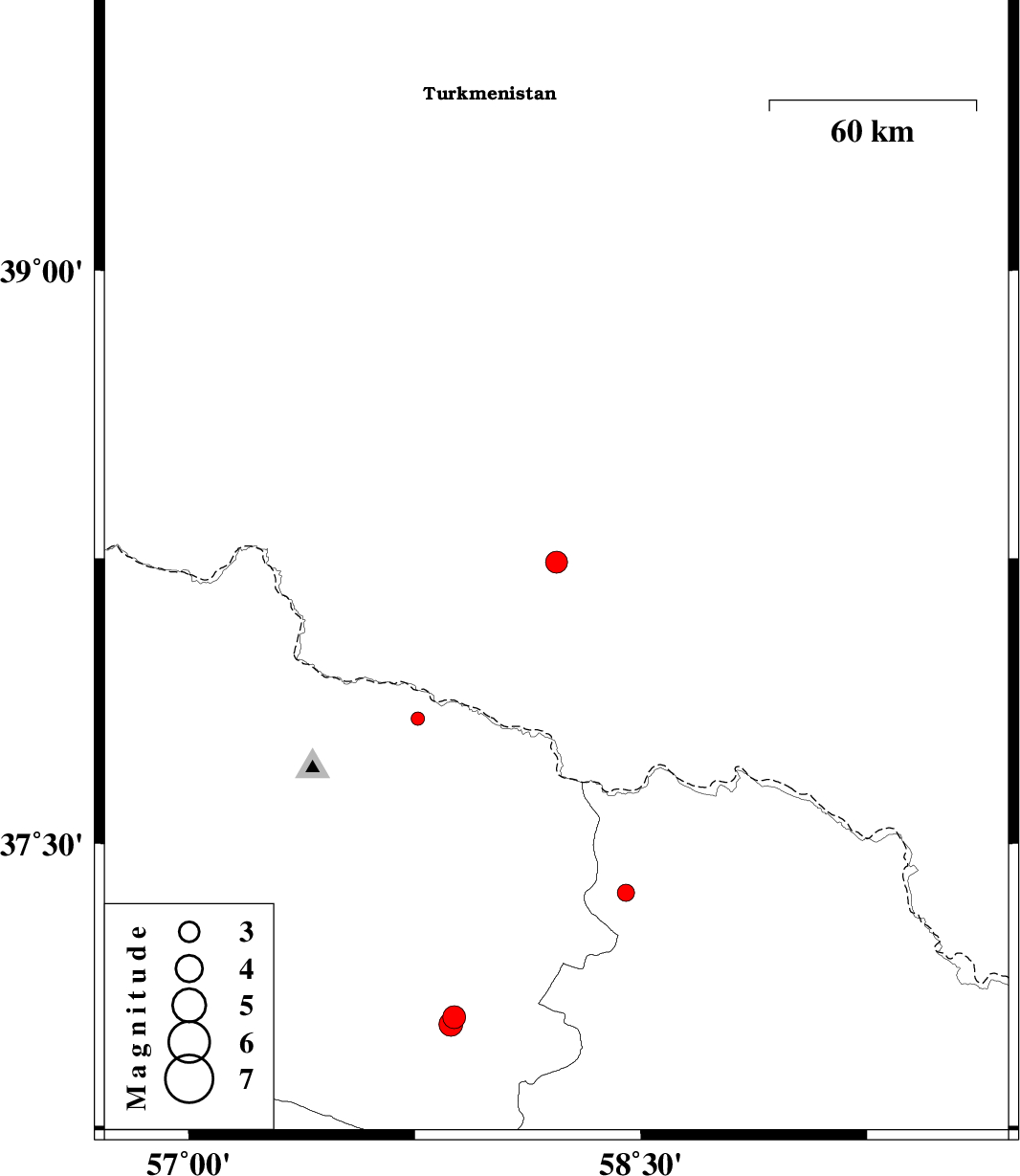 | 2012/09/17 | 04:26:55.8 | 08:56:55.8 | 37.83 | 57.76 | 6 | ML:2 | Khorasan(north) Province, 52 km North-West of Shirvan | ||