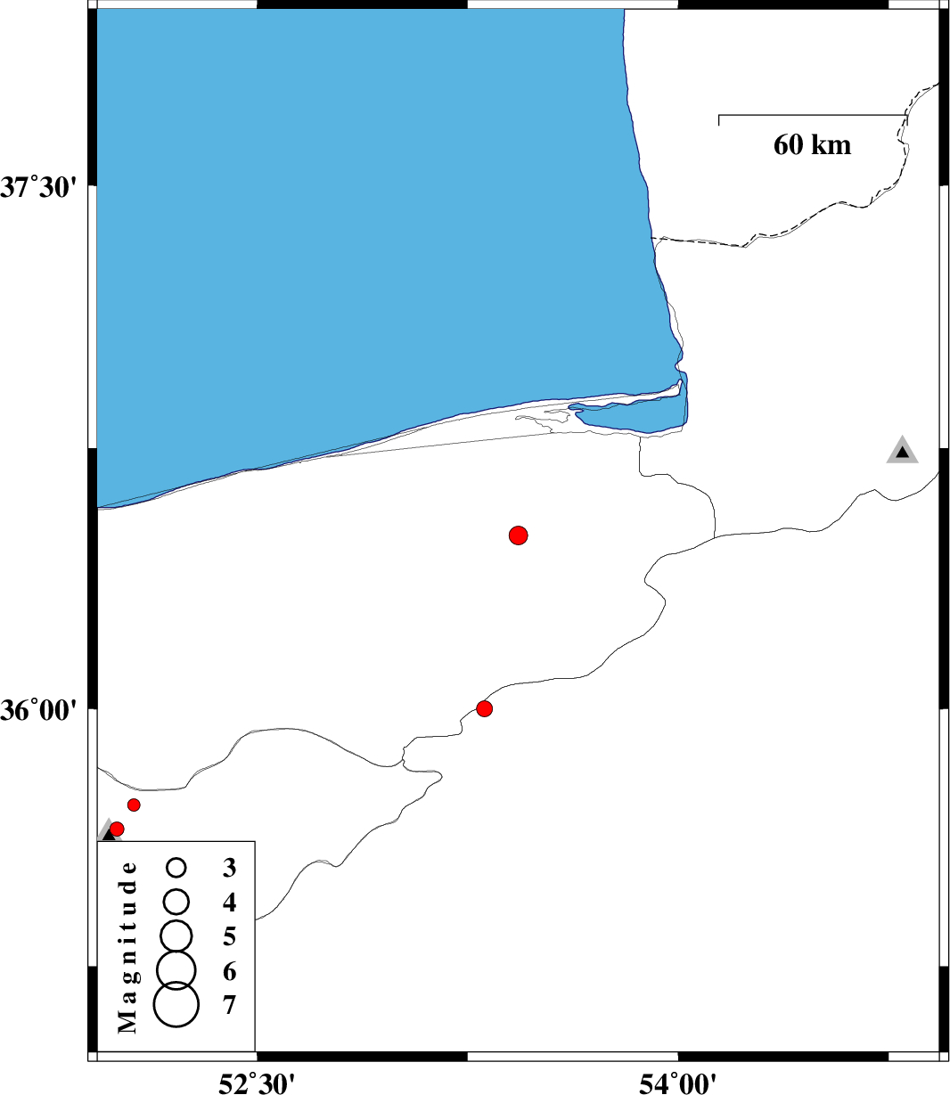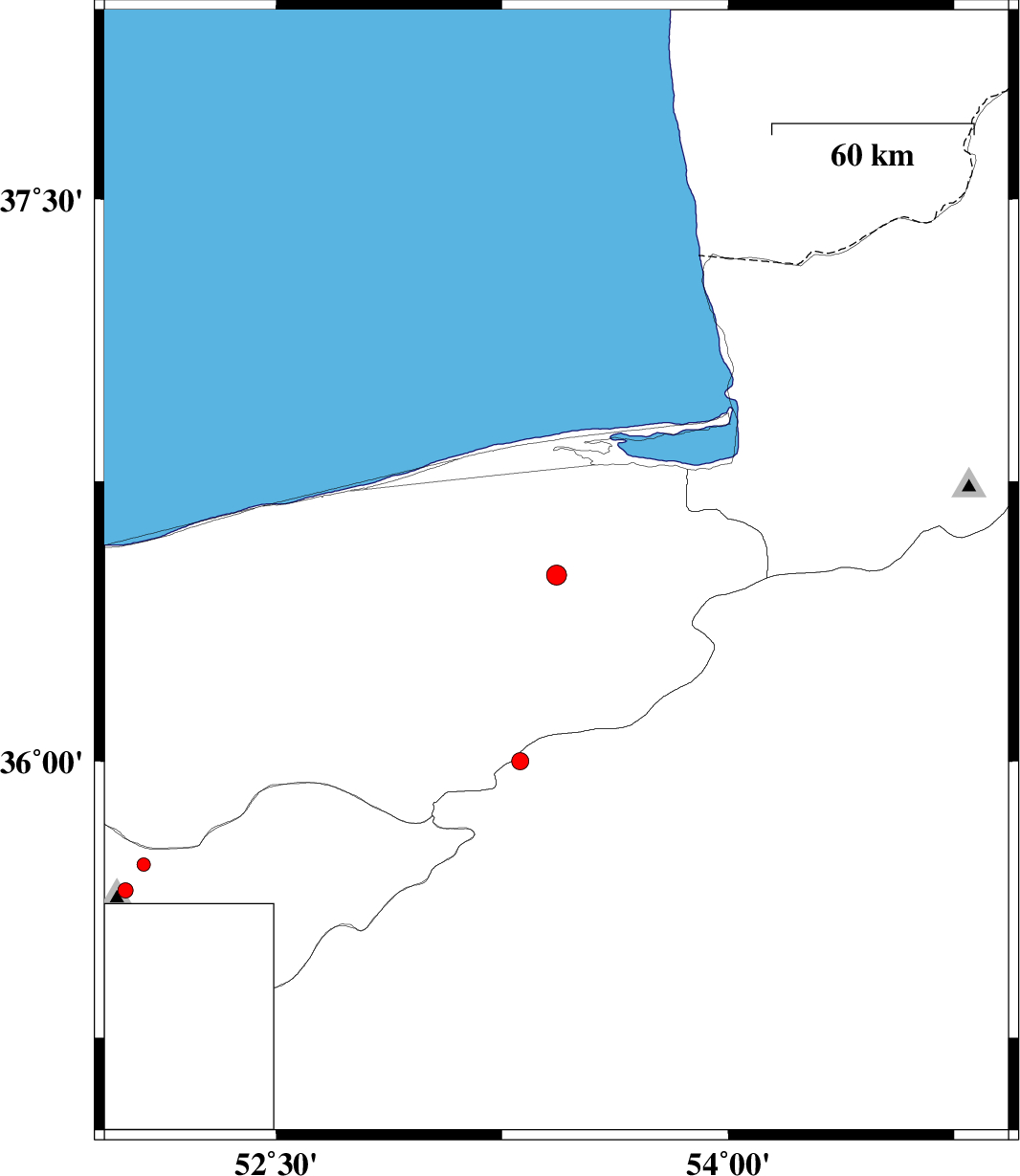 | 2012/09/23 | 01:04:50.1 | 04:34:50.1 | 36.5 | 53.43 | 14 | ML:2.9 | Mazandaran Province, 20 km South-East of Neka | ||