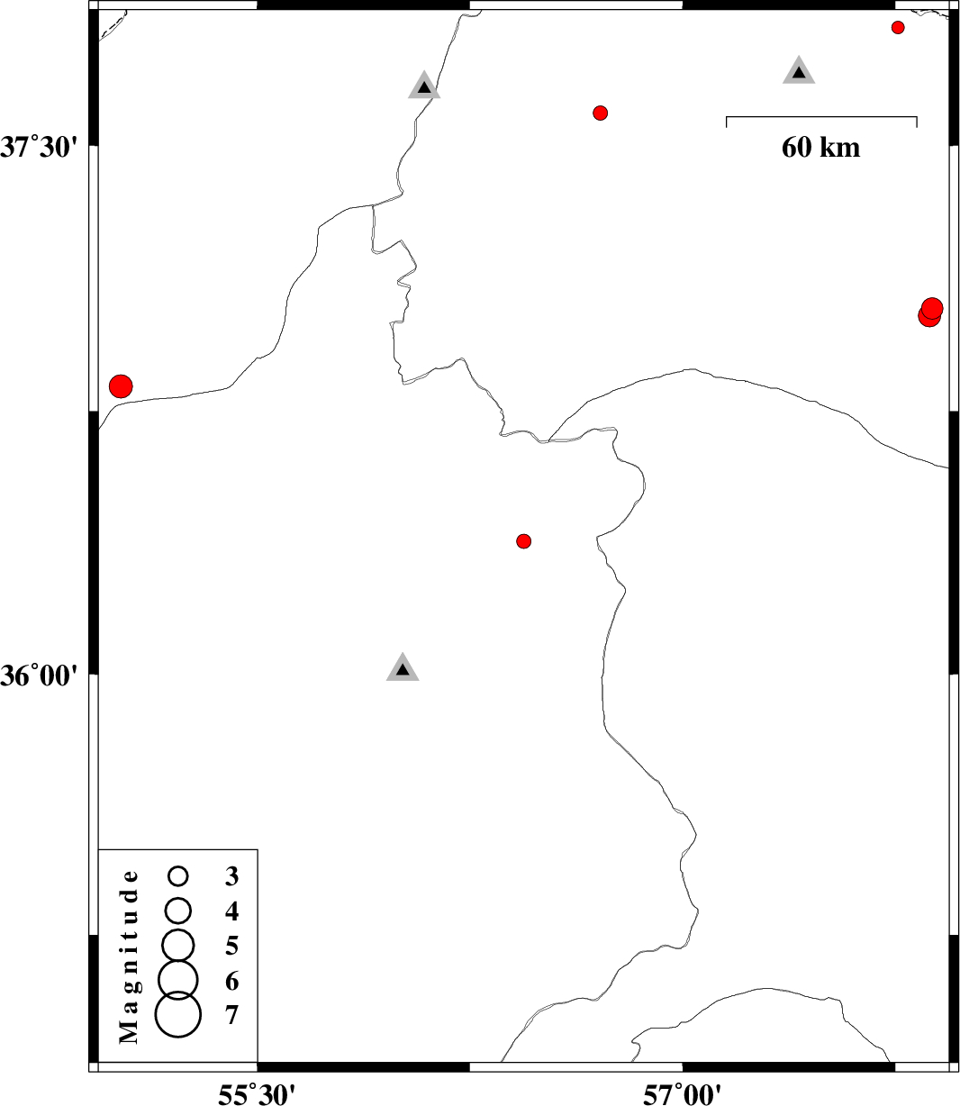 | 2012/09/17 | 04:26:55.8 | 08:56:55.8 | 37.83 | 57.76 | 6 | ML:2 | Khorasan(north) Province, 52 km North-West of Shirvan | ||