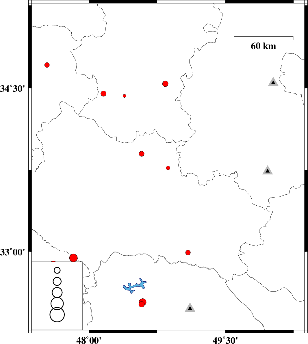 2012/09/24 | 10:30:09.2 | 14:00:09.2 | 33.77 | 48.87 | 18 | ML:1.9 | Lorestan Province, 18 km South-East of Borujerd | ||