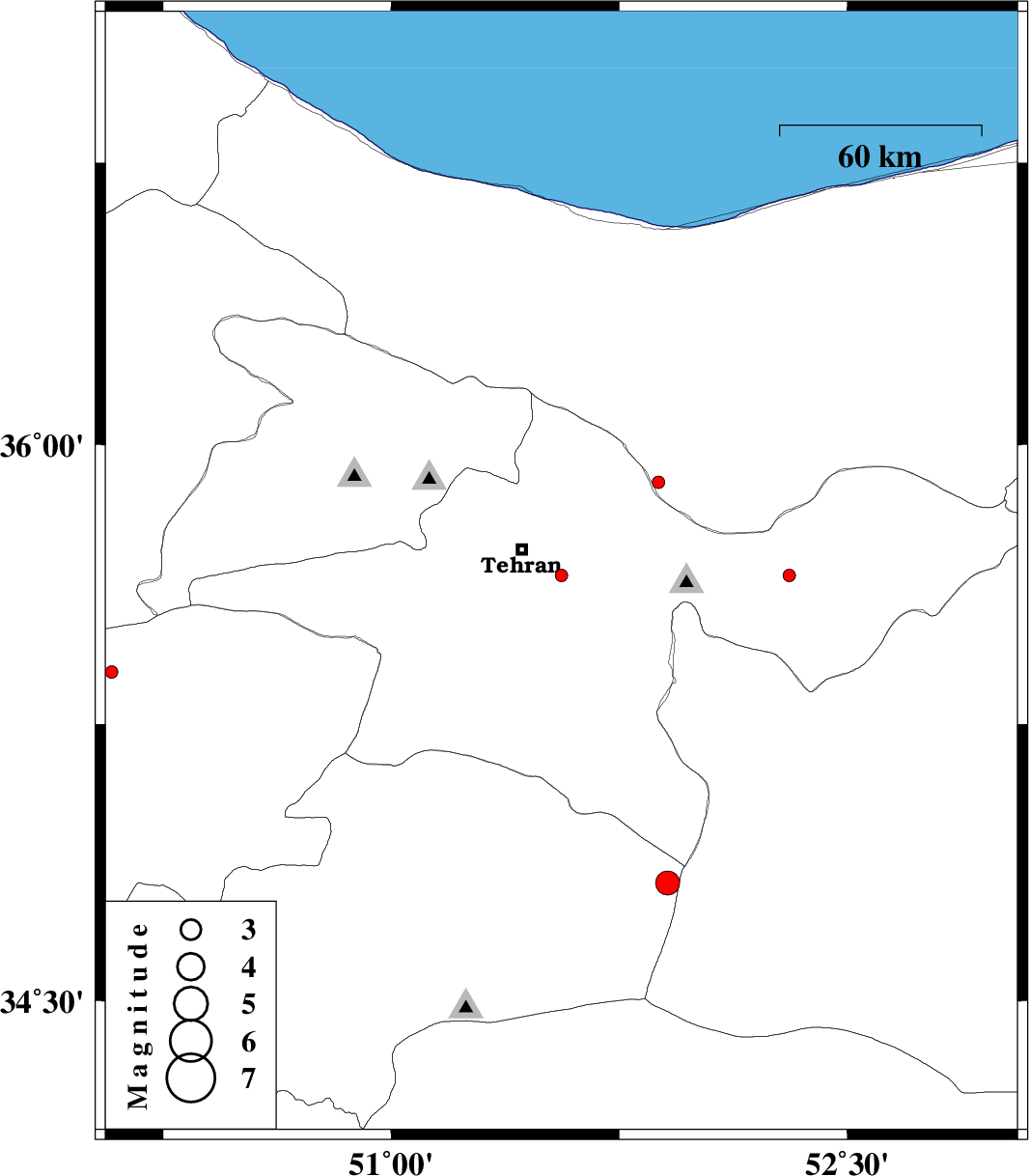 | 2012/09/25 | 08:15:04.2 | 11:45:04.2 | 34.82 | 51.91 | 14 | ML:3.5 | Qom Province, 60 km South-East of Varamin | ||