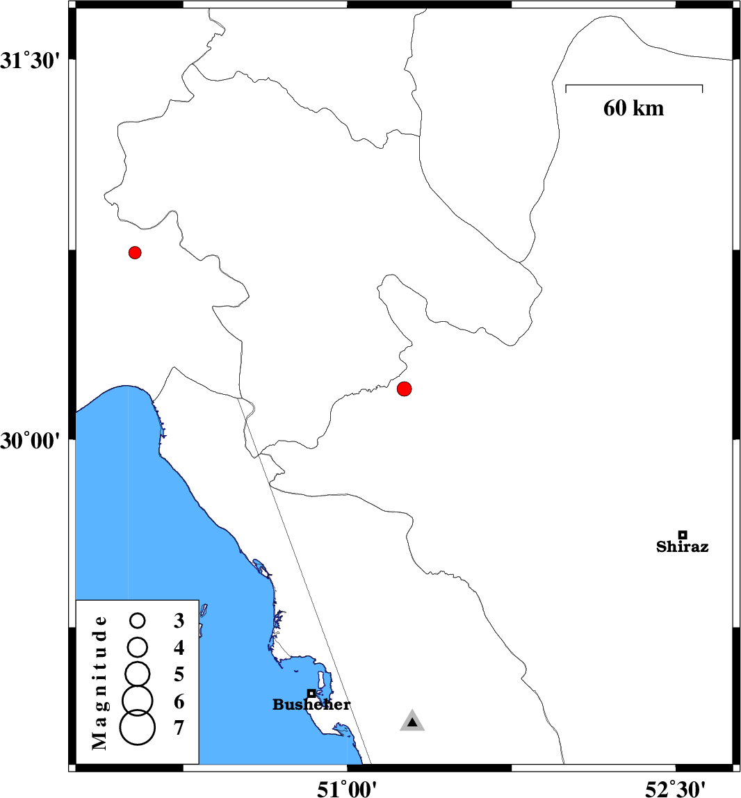 | 2012/09/26 | 22:58:34.8 | 02:28:34.8 | 30.2 | 51.26 | 46 | ML:3 | Fars Province, 27 km West of Nurabad | ||