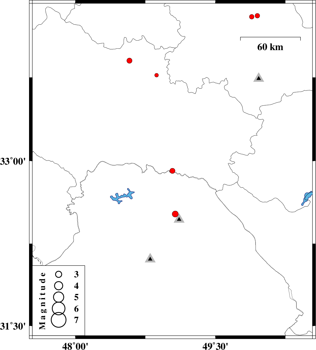 | 2012/09/24 | 10:30:09.2 | 14:00:09.2 | 33.77 | 48.87 | 18 | ML:1.9 | Lorestan Province, 18 km South-East of Borujerd |