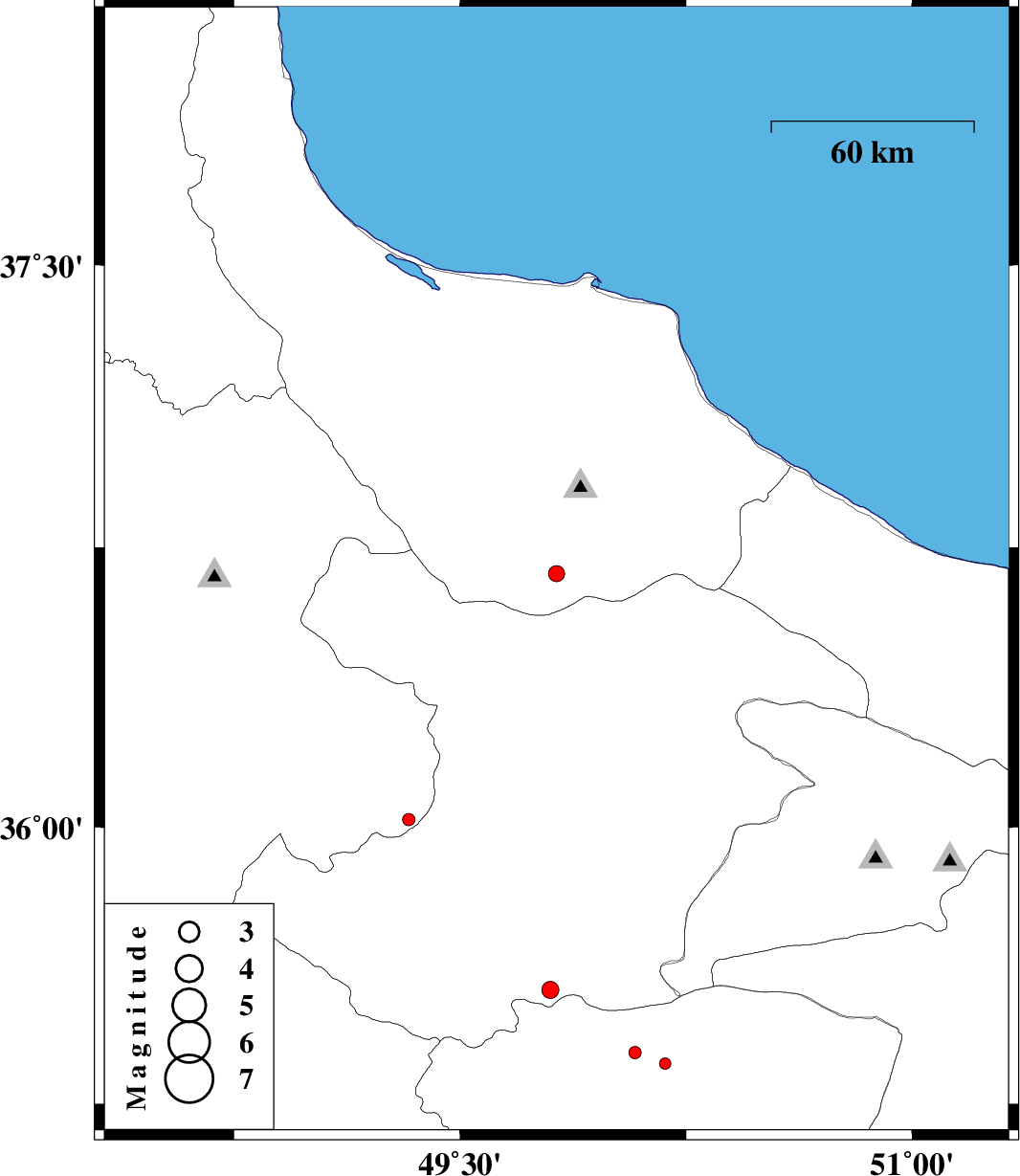 | 2012/09/30 | 04:35:06.1 | 08:05:06.1 | 36.68 | 49.82 | 15 | ML:2.4 | Gilan Province, 52 km South of Siahkal | ||