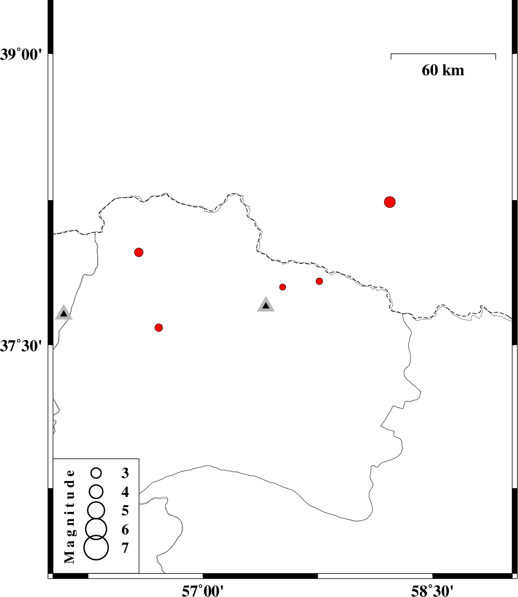 | 2012/10/01 | 00:39:17.6 | 04:09:17.6 | 37.8 | 57.52 | 14 | ML:1.9 | Khorasan(north) Province, 40 km North-East of Bojnurd | ||