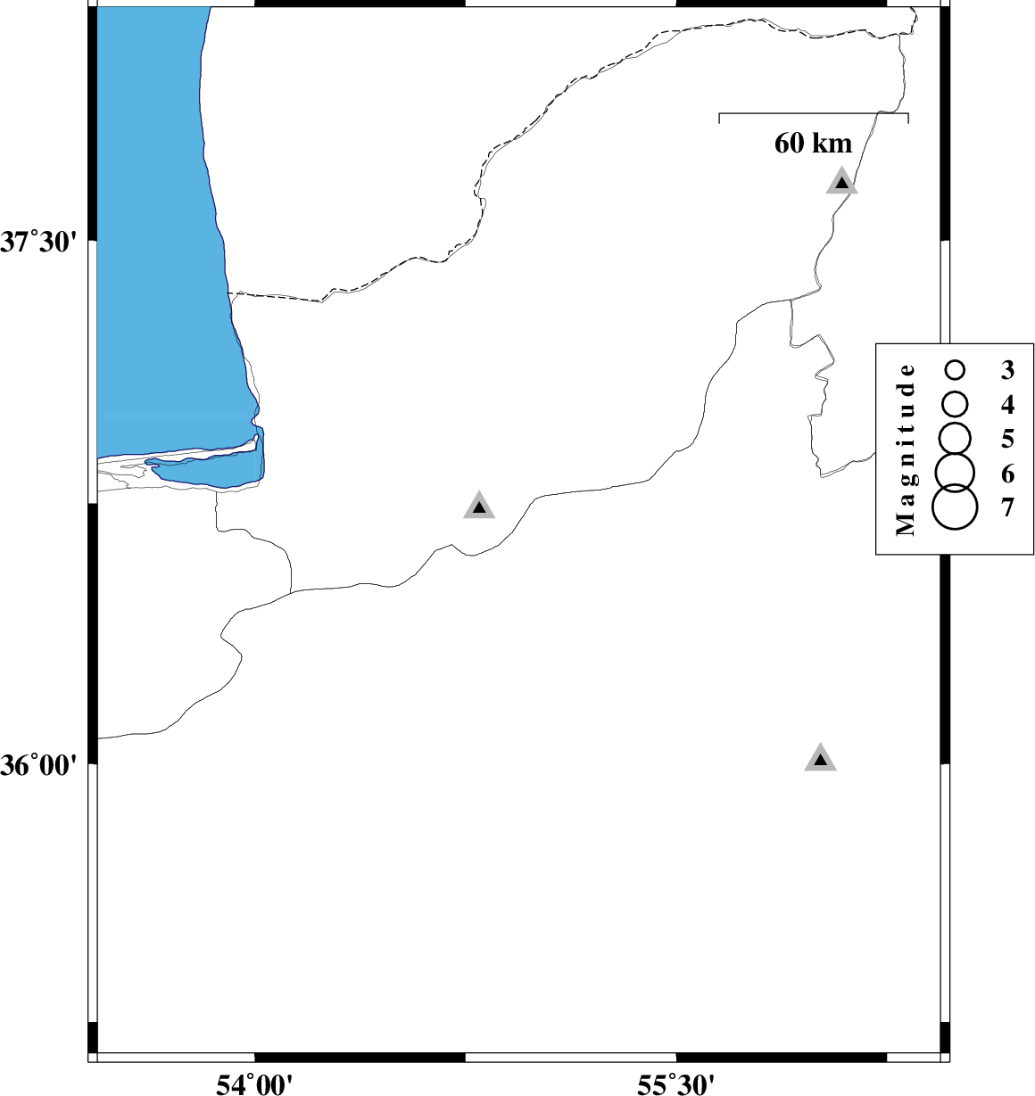 | 2012/10/01 | 19:23:29.1 | 22:53:29.1 | 36.66 | 54.94 | 15 | ML:3.8 | Semnan Province, 27 km North of Shahrud | ||