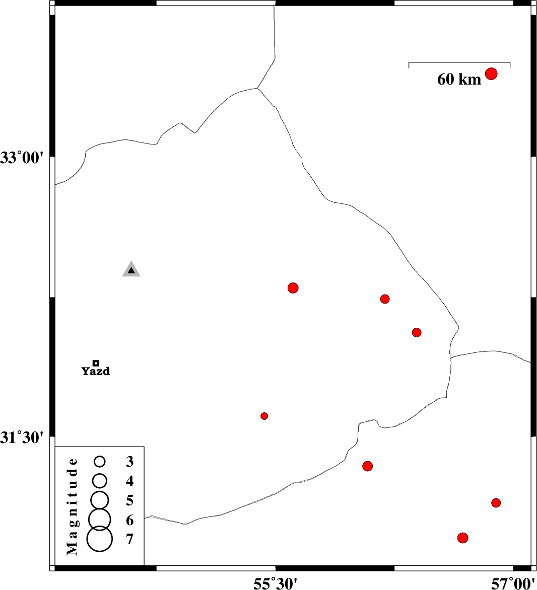 | 2012/09/21 | 11:51:09.4 | 15:21:09.4 | 31.61 | 55.43 | 22 | ML:2 | Yazd Province, 3 km Bafq | ||