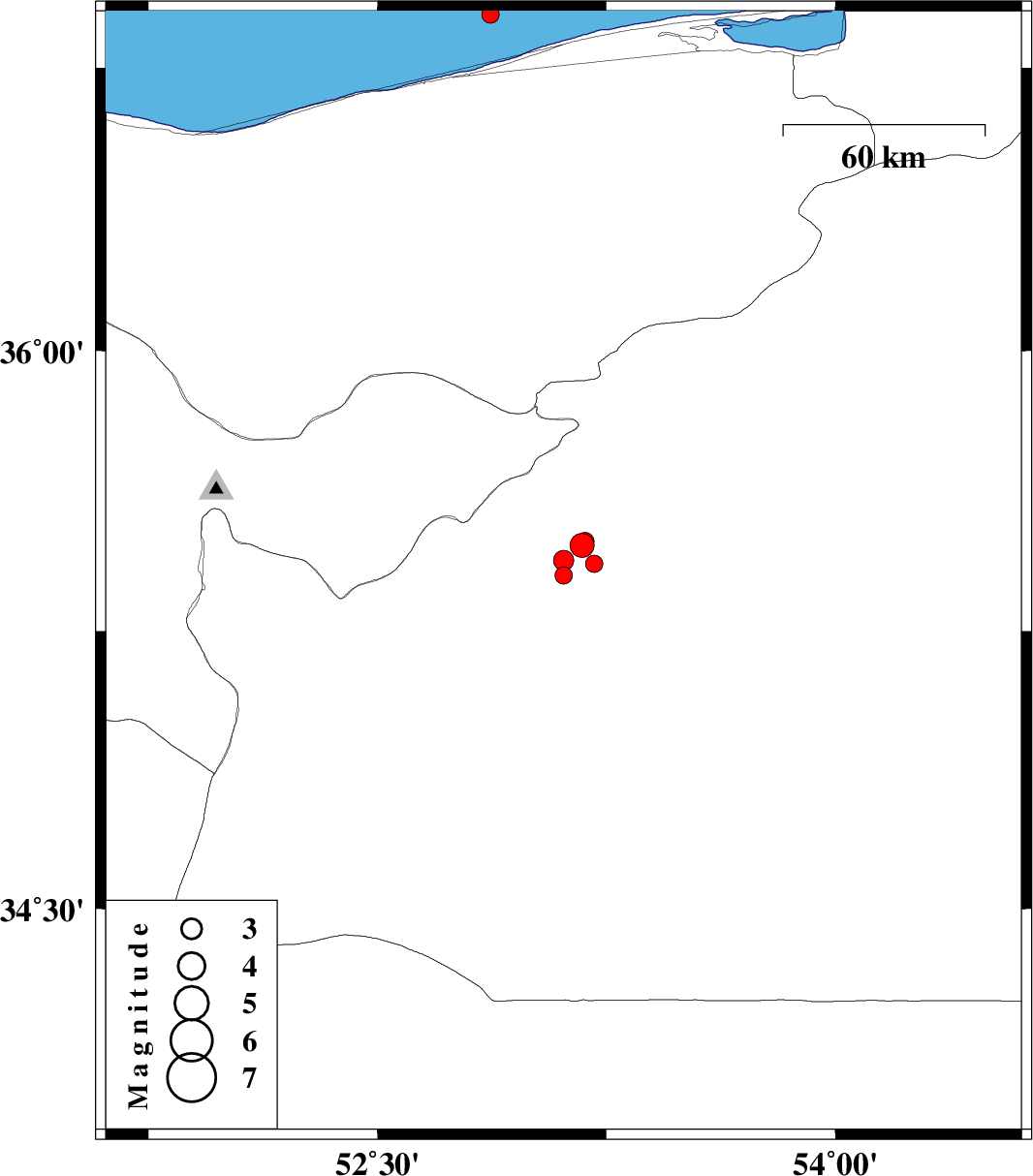 | 2012/10/07 | 16:01:23.9 | 19:31:23.9 | 36.89 | 52.87 | 14 | ML:2.5 | Caspian Sea, 29 km North of Joybar |