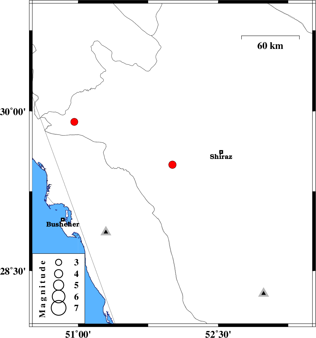 | 2012/10/09 | 01:53:44.7 | 05:23:44.7 | 29.5 | 52.01 | 17 | ML:3.6 | Fars Province, 37 km South-East of Kazerun | ||