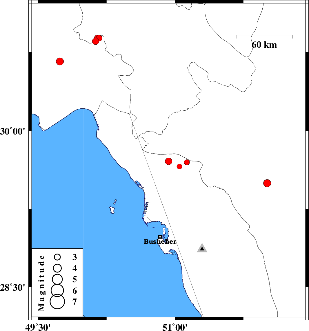 | 2012/10/15 | 18:44:36.3 | 22:14:36.3 | 29.71 | 50.93 | 27 | ML:3.4 | Bushehr Province, 43 km North-East of Bandar-e genaveh | ||