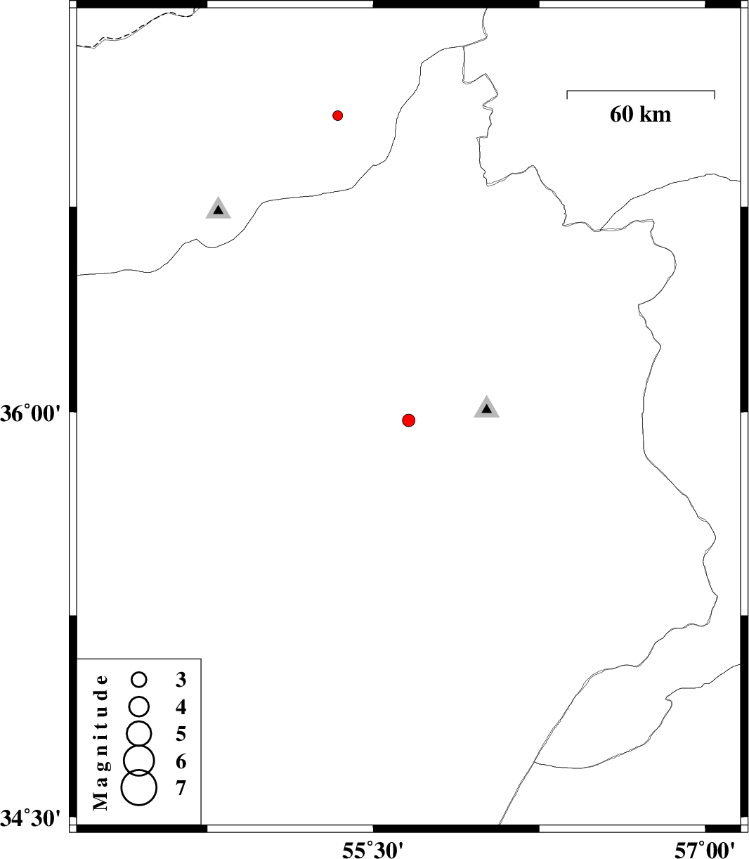 | 2012/10/16 | 00:15:36.2 | 03:45:36.2 | 35.97 | 55.66 | 6 | ML:2.6 | Semnan Province, 79 km South-East of Shahrud | ||