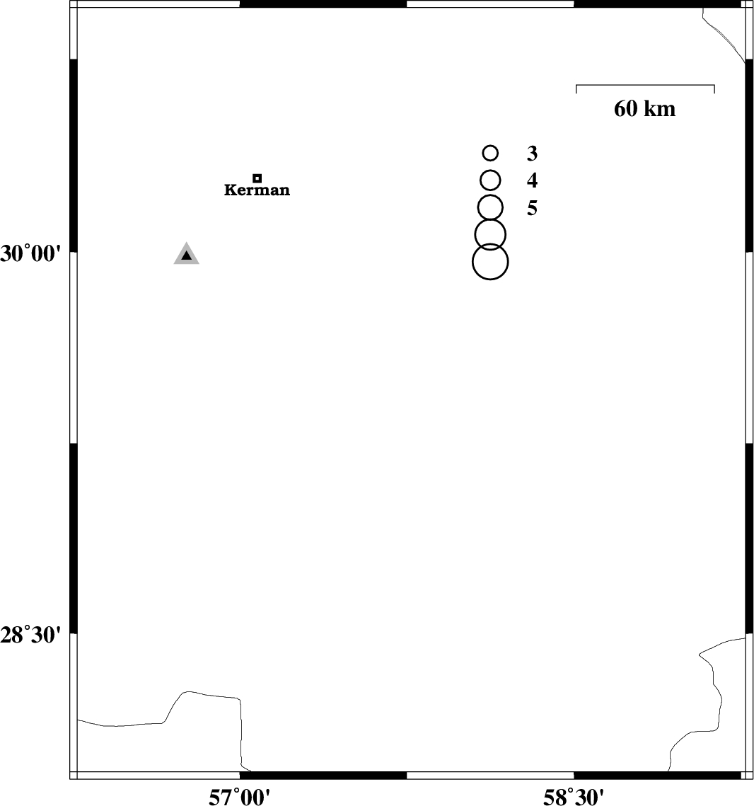 | 2012/10/16 | 04:23:41.3 | 07:53:41.3 | 29.45 | 57.77 | 15 | ML:4.2 | Kerman Province, 87 km North of Jiroft |