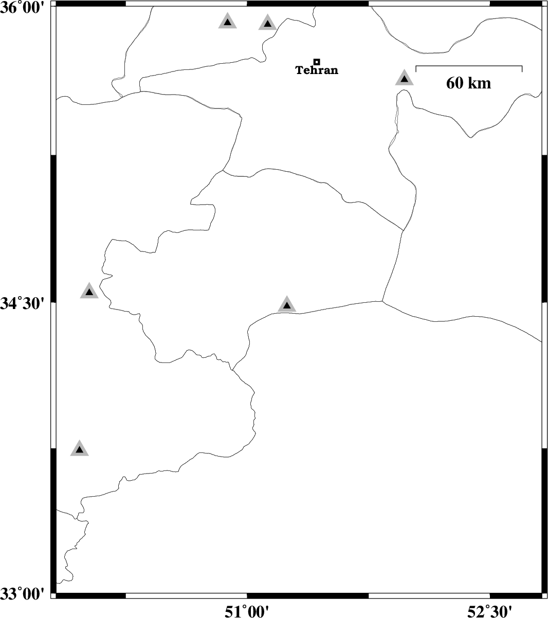 | 2012/10/15 | 03:54:45.8 | 07:24:45.8 | 35.21 | 51.79 | 26 | ML:1.8 | Tehran Province, 17 km South-East of Varamin | ||