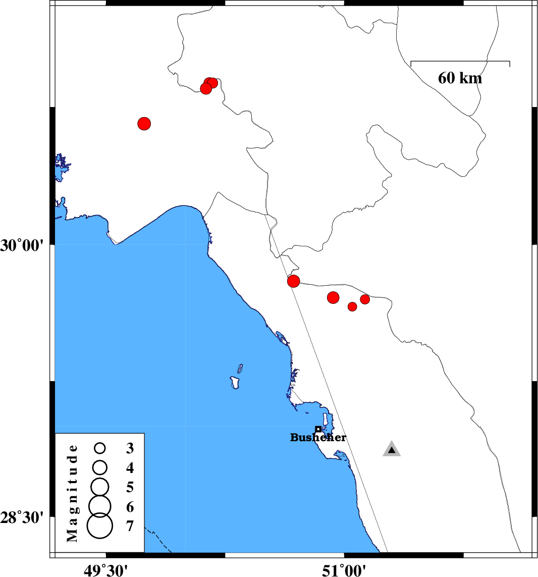 | 2012/10/17 | 04:19:13.3 | 07:49:13.3 | 29.8 | 50.68 | 14 | ML:3.5 | Fars Province, 30 km North-East of Bandar-e genaveh | ||