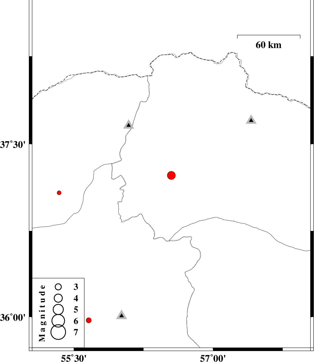 | 2012/10/16 | 00:15:36.2 | 03:45:36.2 | 35.97 | 55.66 | 6 | ML:2.6 | Semnan Province, 79 km South-East of Shahrud | ||