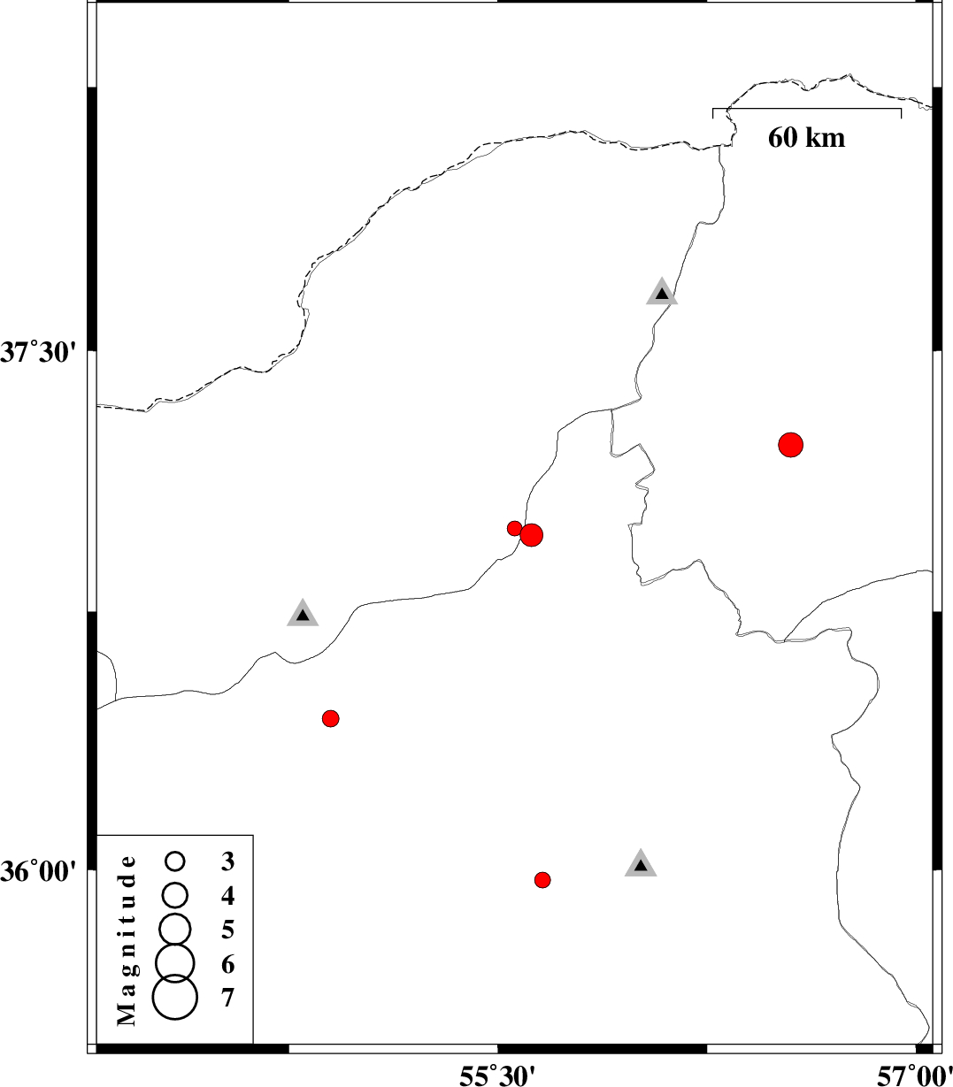| 2012/10/16 | 00:15:36.2 | 03:45:36.2 | 35.97 | 55.66 | 6 | ML:2.6 | Semnan Province, 79 km South-East of Shahrud |