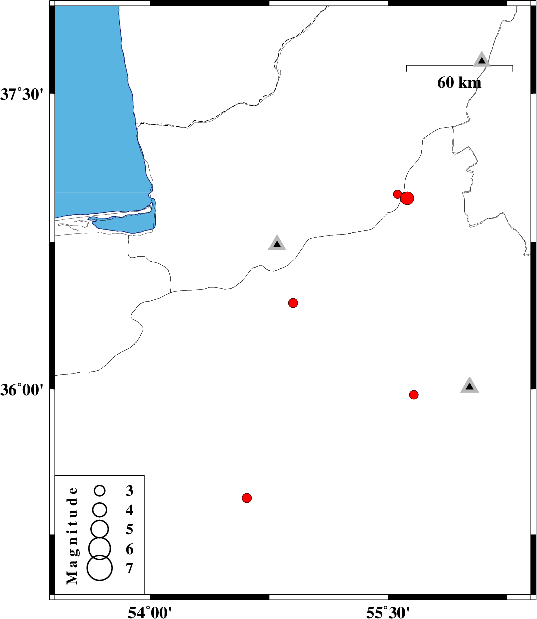 | 2012/10/21 | 19:07:50.1 | 22:37:50.1 | 36.97 | 55.62 | 6 | ML:3.7 | Semnan Province, 36 km South-East of Minodasht | ||