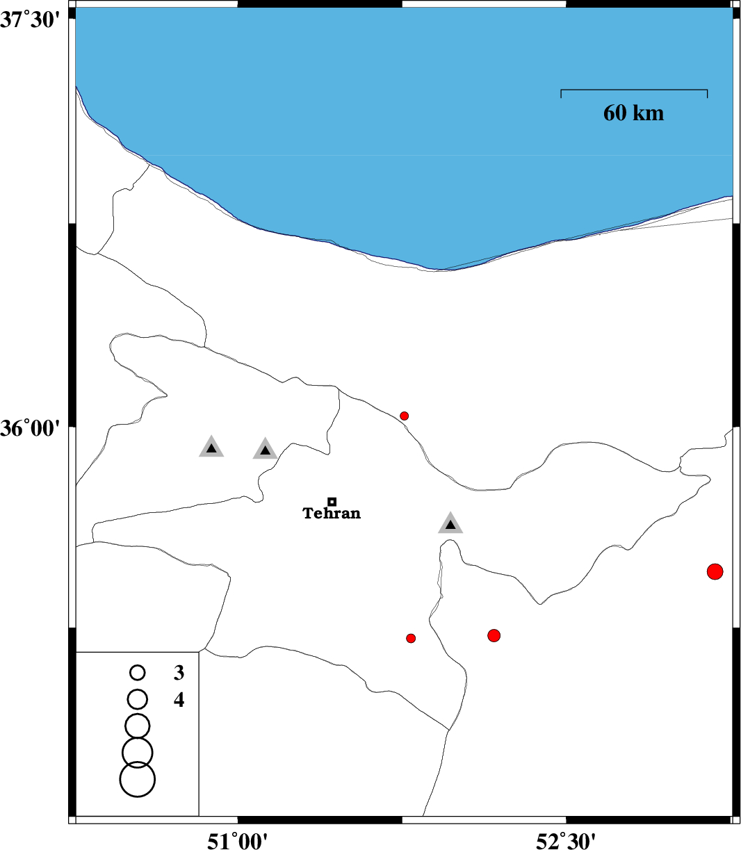 | 2012/10/20 | 10:25:05.1 | 13:55:05.1 | 35.22 | 52.17 | 14 | ML:2.5 | Semnan Province, 15 km West of Garmsar | ||