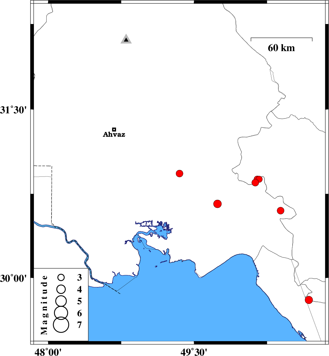 | 2012/10/14 | 07:46:45.8 | 11:16:45.8 | 30.88 | 50.17 | 14 | ML:3 | Kohkiluieh va boyerahmad Province, 32 km North of Behbahan | ||