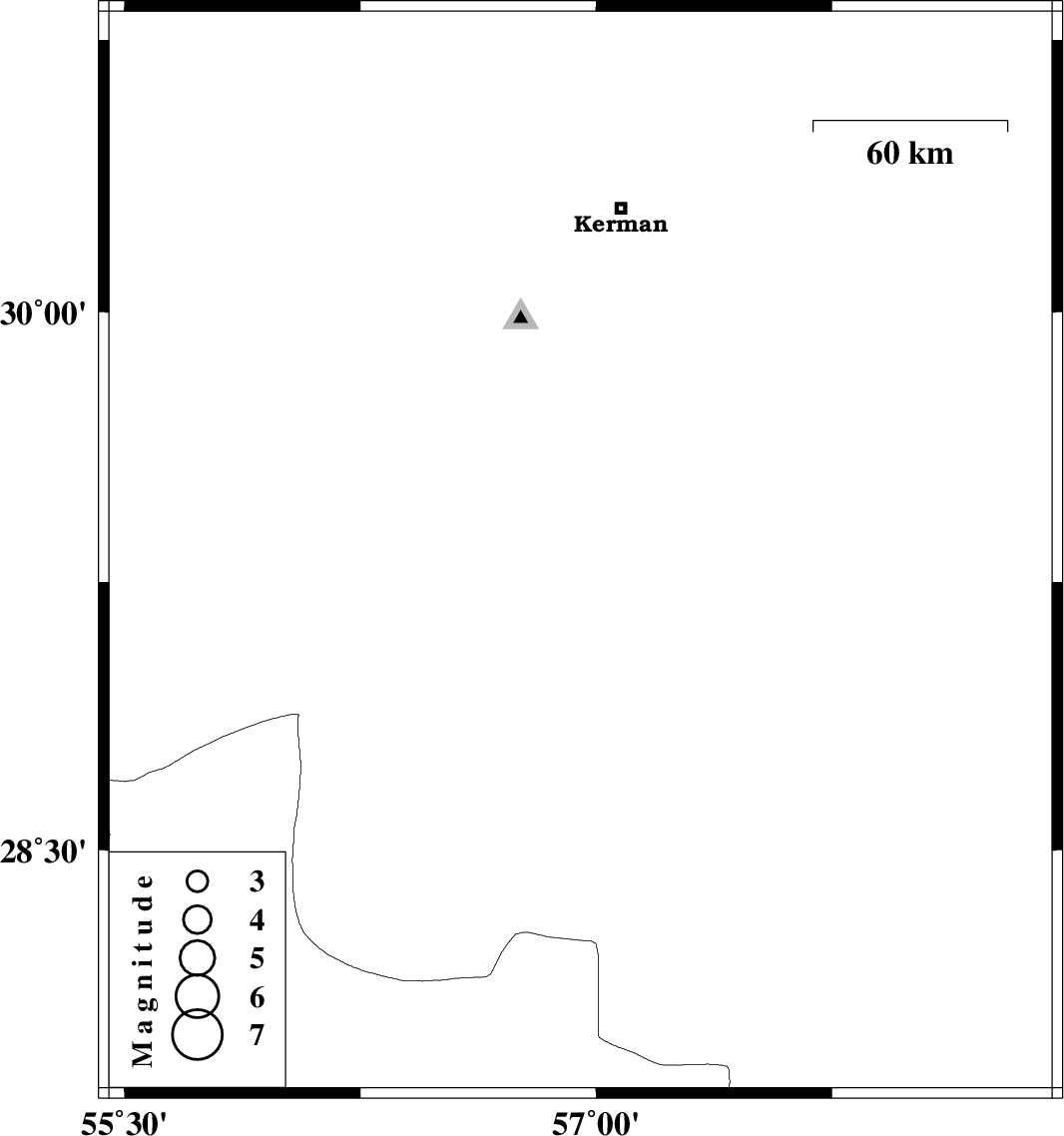 | 2012/10/27 | 20:54:54.8 | 00:24:54.8 | 29.33 | 56.95 | 15 | ML:4.5 | Kerman Province, 35 km East of Baft |