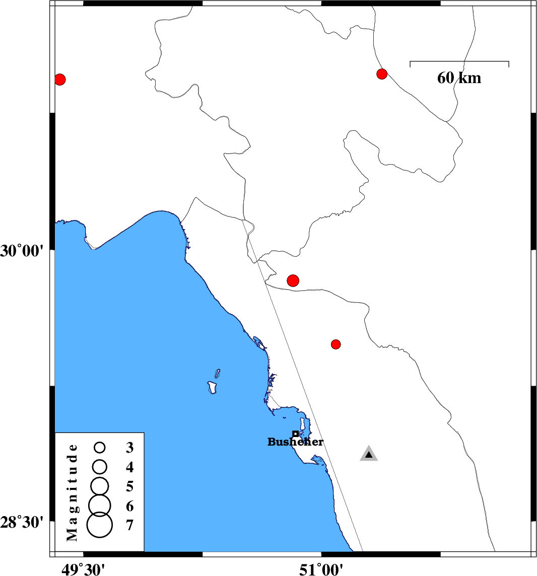 | 2012/10/21 | 06:44:18.7 | 10:14:18.7 | 29.48 | 51.09 | 14 | ML:2.7 | Bushehr Province, 26 km North-West of Borazjan |