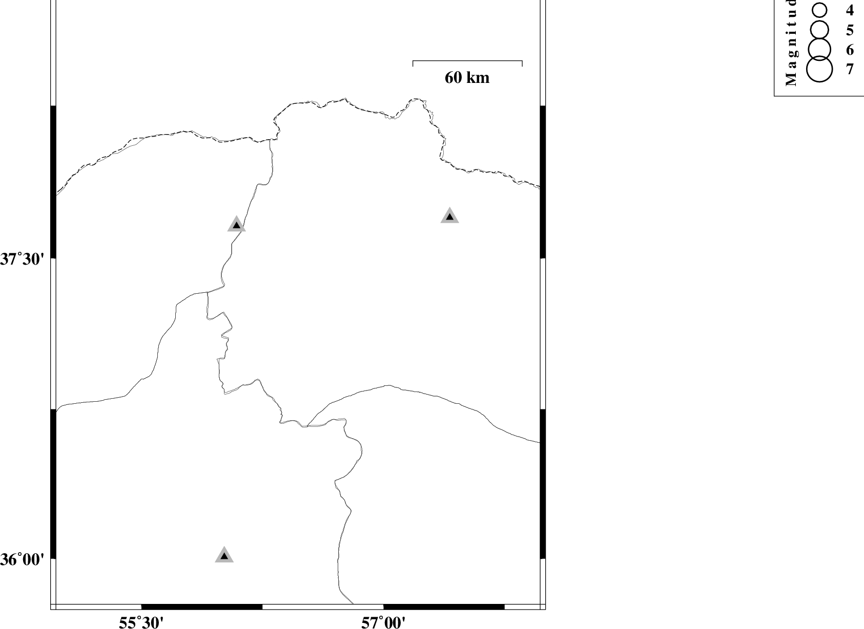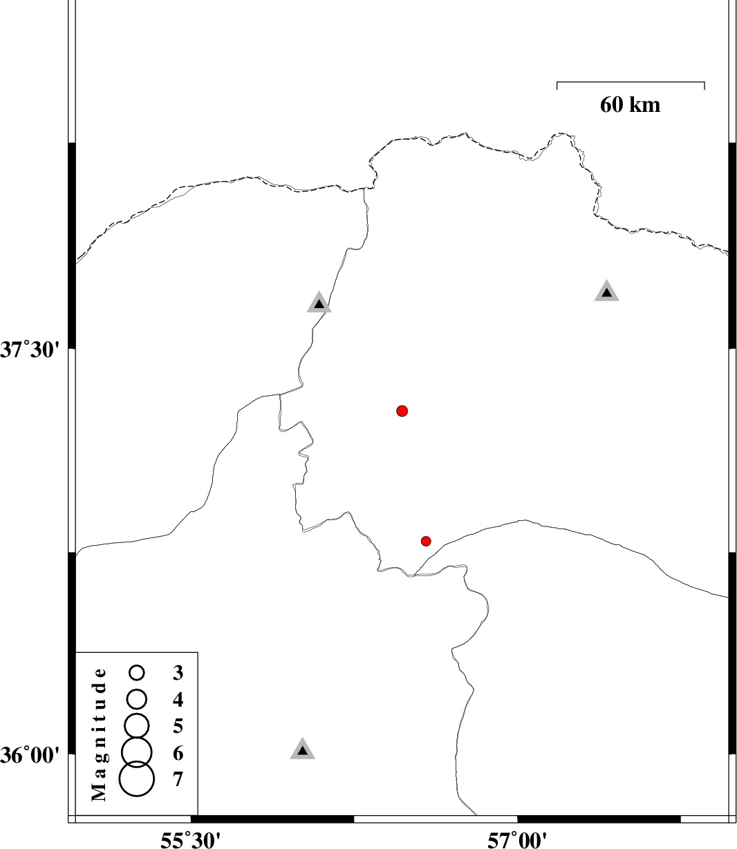 | 2012/10/23 | 05:16:07.8 | 08:46:07.8 | 36.79 | 56.58 | 15 | ML:2 | Khorasan(north) Province, 25 km South-East of Jajarm |
