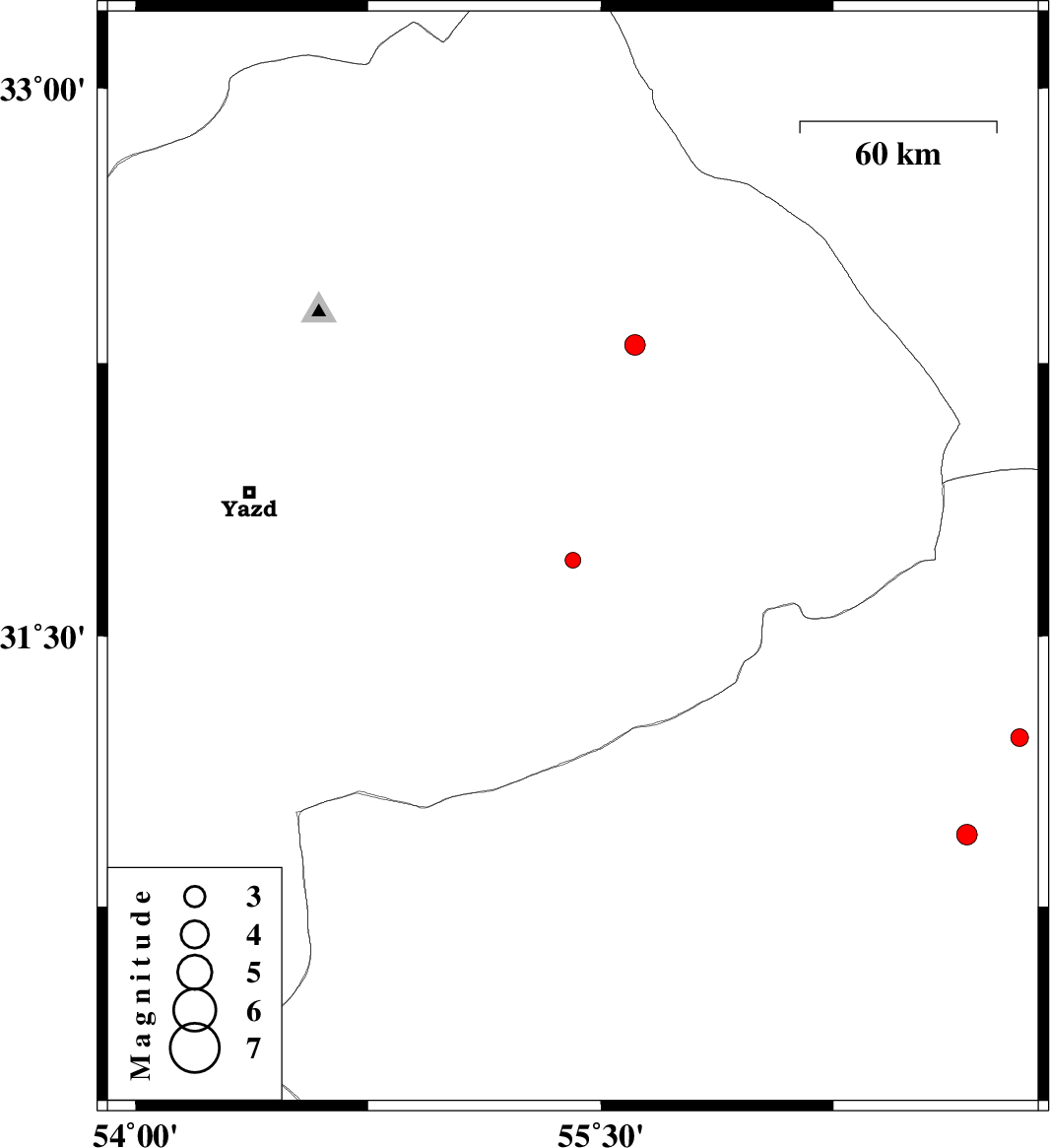 | 2012/10/05 | 03:16:23.1 | 06:46:23.1 | 30.95 | 56.68 | 15 | ML:3 | Kerman Province, 19 km North-East of Zarand |