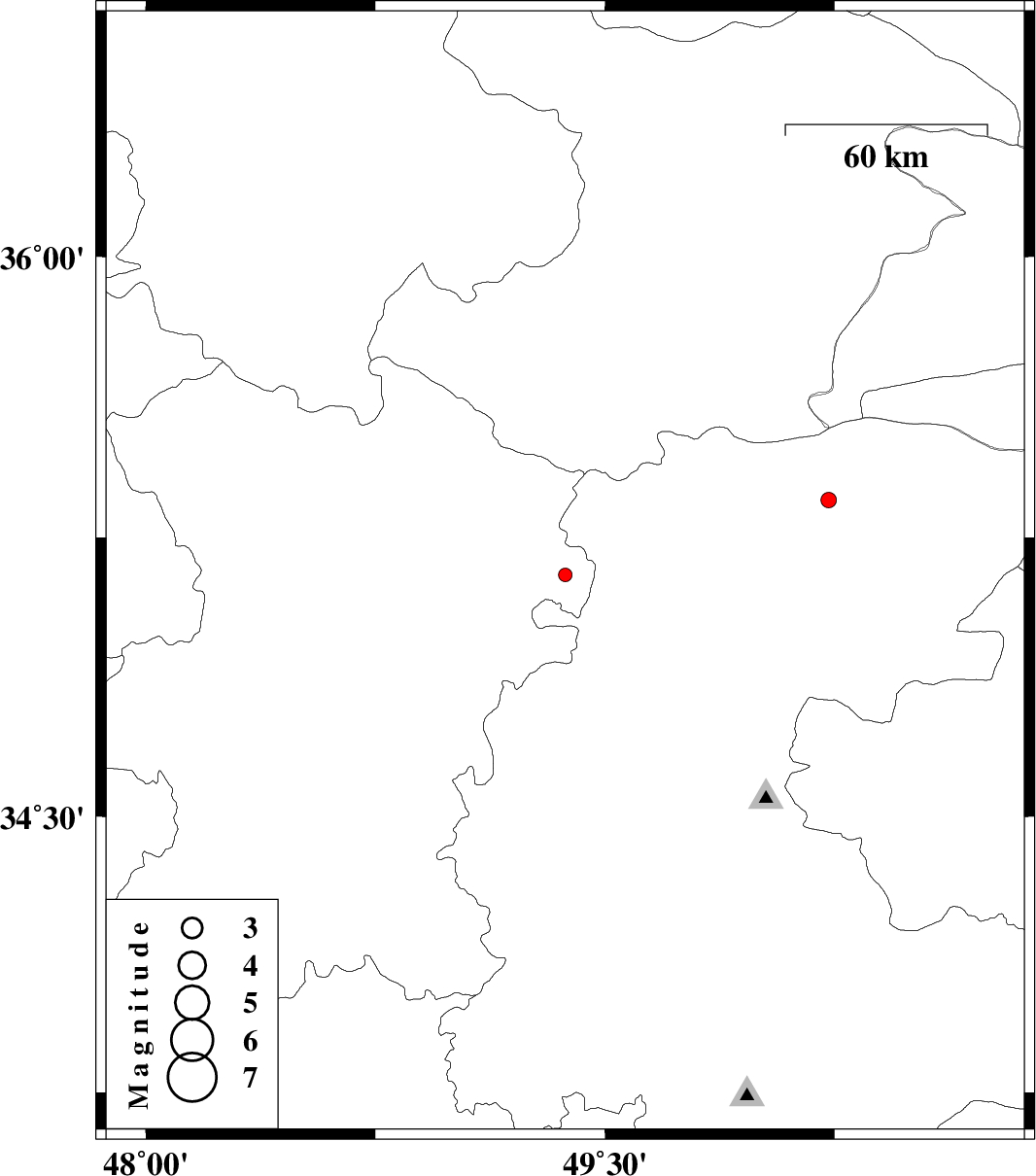| 2012/10/31 | 09:21:58.2 | 12:51:58.2 | 35.15 | 49.37 | 15 | ML:2 | Hamedan Province, 40 km South-East of Razan |