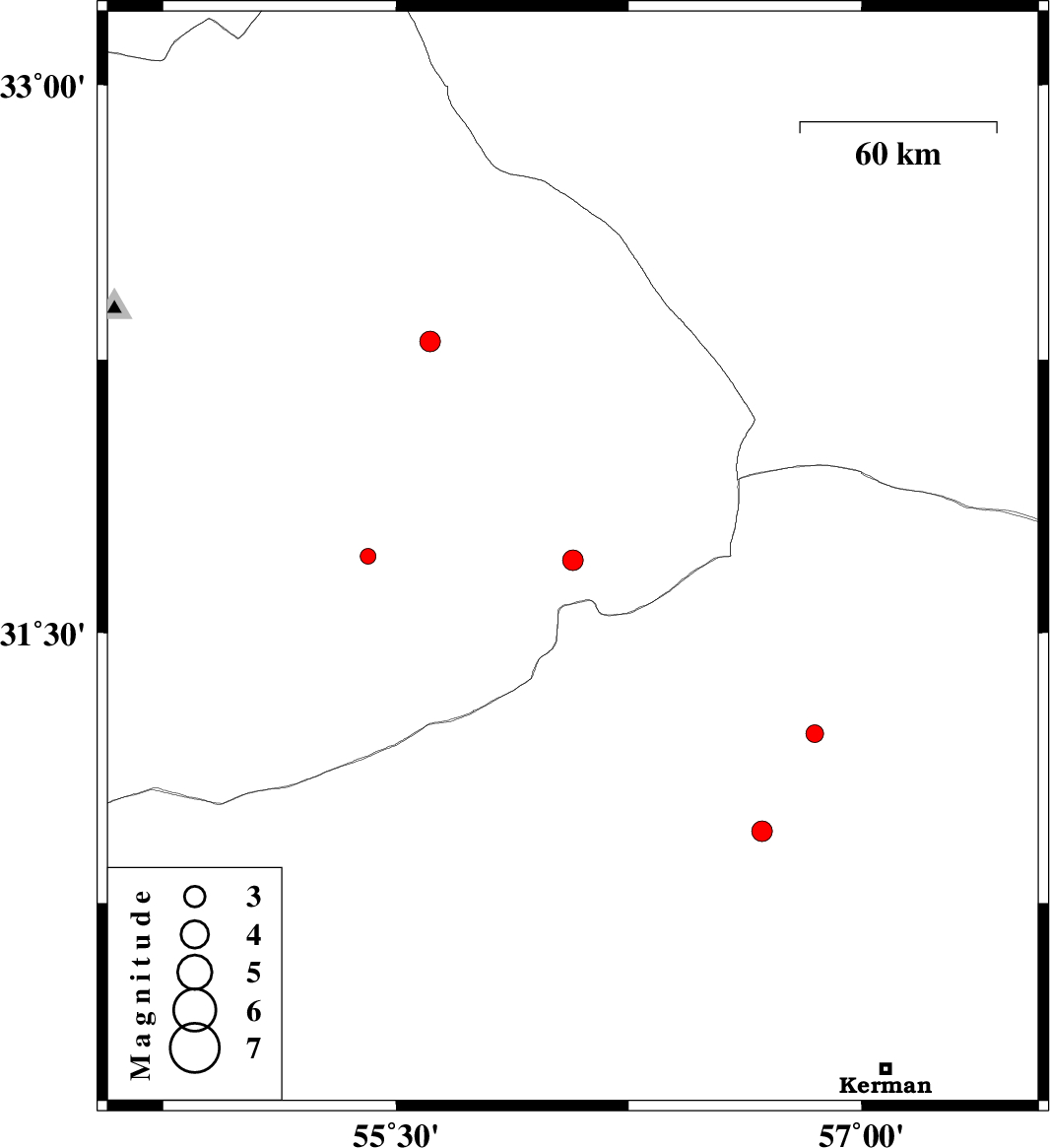 | 2012/10/05 | 03:16:23.1 | 06:46:23.1 | 30.95 | 56.68 | 15 | ML:3 | Kerman Province, 19 km North-East of Zarand |