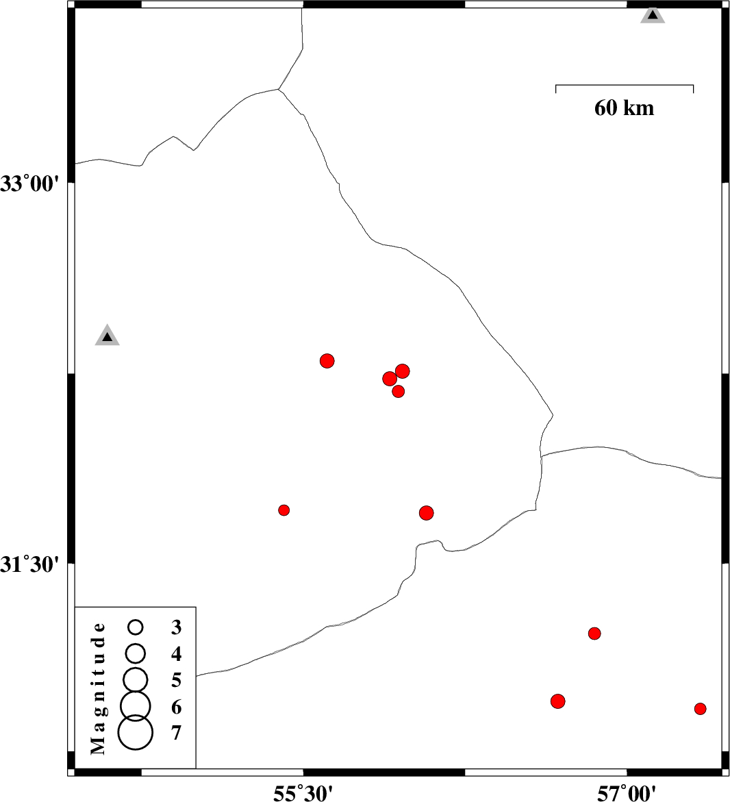 | 2012/10/05 | 03:16:23.1 | 06:46:23.1 | 30.95 | 56.68 | 15 | ML:3 | Kerman Province, 19 km North-East of Zarand |