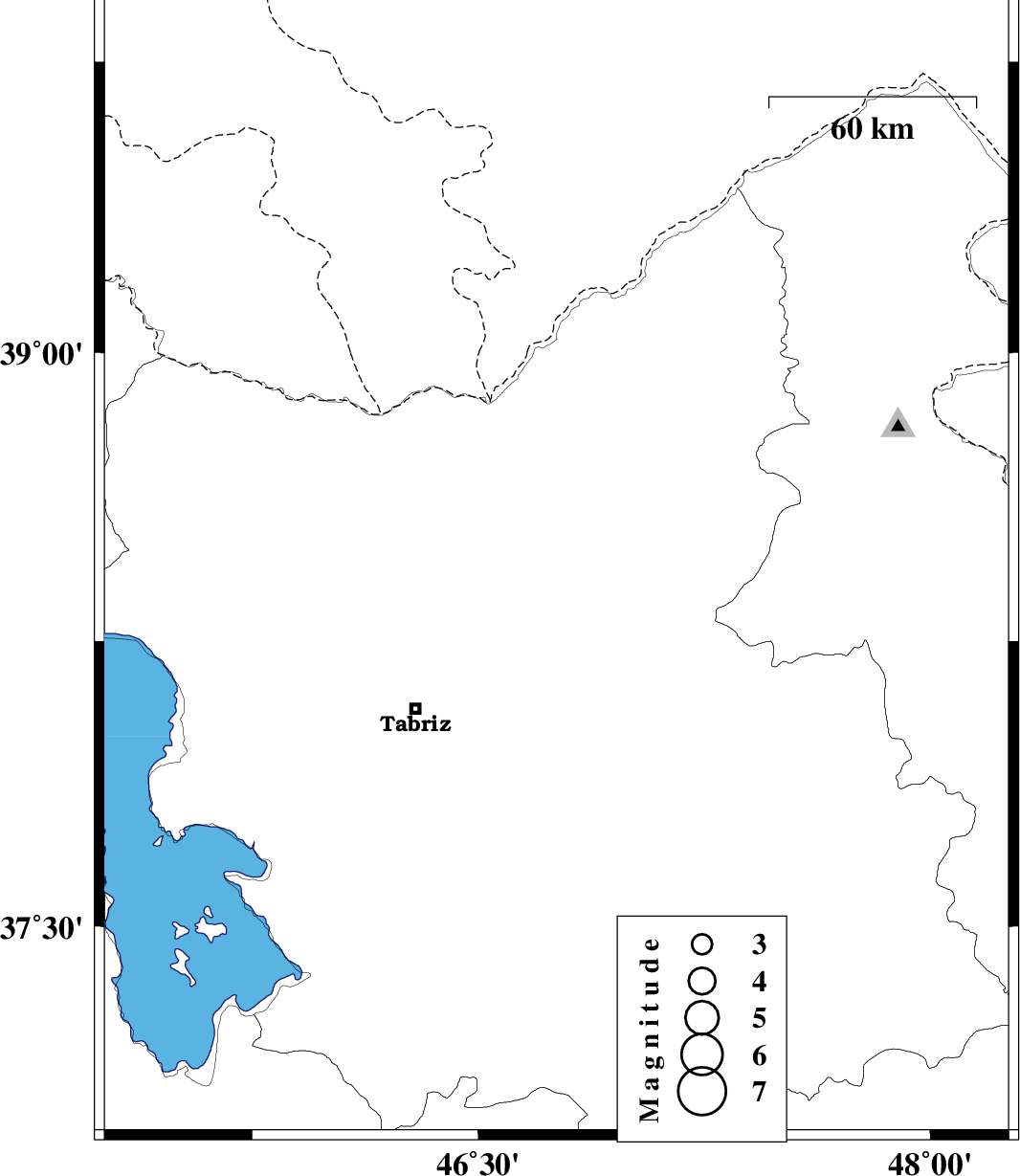 2012/10/27 | 03:56:42.3 | 07:26:42.3 | 38.49 | 46.66 | 17 | ML:3.8 | Azarbaijan Sharghi Province, 37 km West of Ahar |