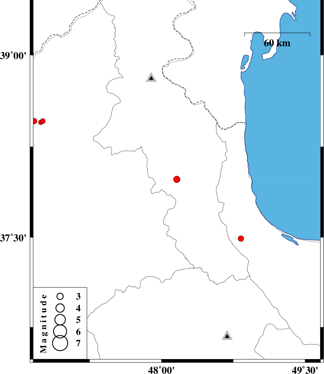 | 2012/11/04 | 17:20:04.9 | 20:50:04.9 | 37.98 | 48.16 | 14 | ML:3.1 | Ardebil Province, 11 km Nir | ||