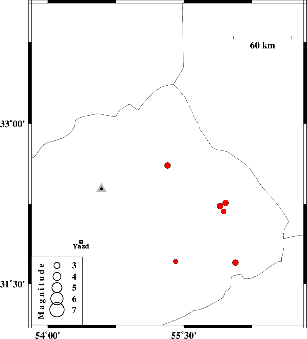| 2012/10/30 | 10:46:31.8 | 14:16:31.8 | 31.71 | 55.41 | 14 | ML:2.2 | Yazd Province, 12 km North of Bafq |