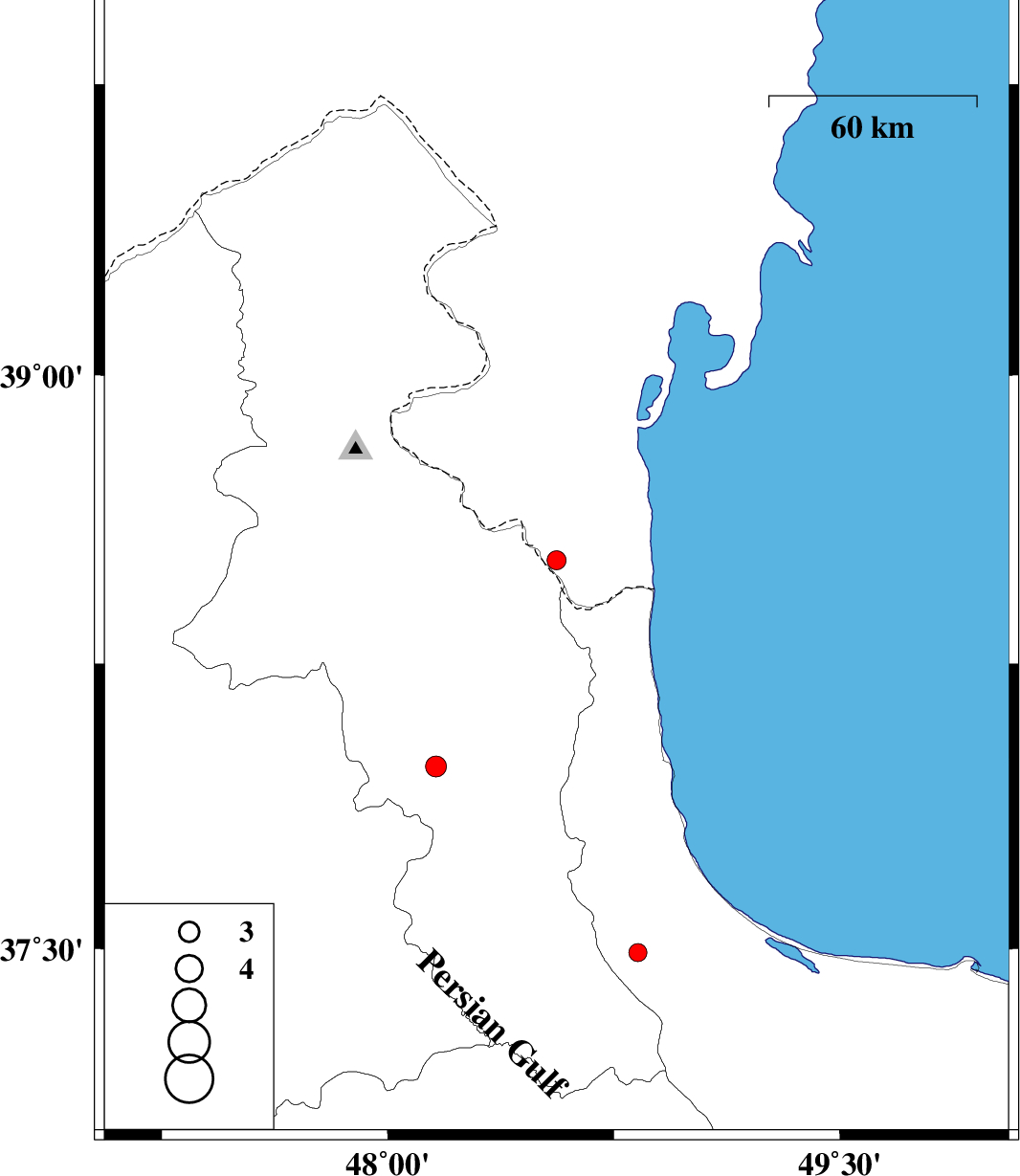 2012/11/04 | 17:20:04.9 | 20:50:04.9 | 37.98 | 48.16 | 14 | ML:3.1 | Ardebil Province, 11 km Nir | ||