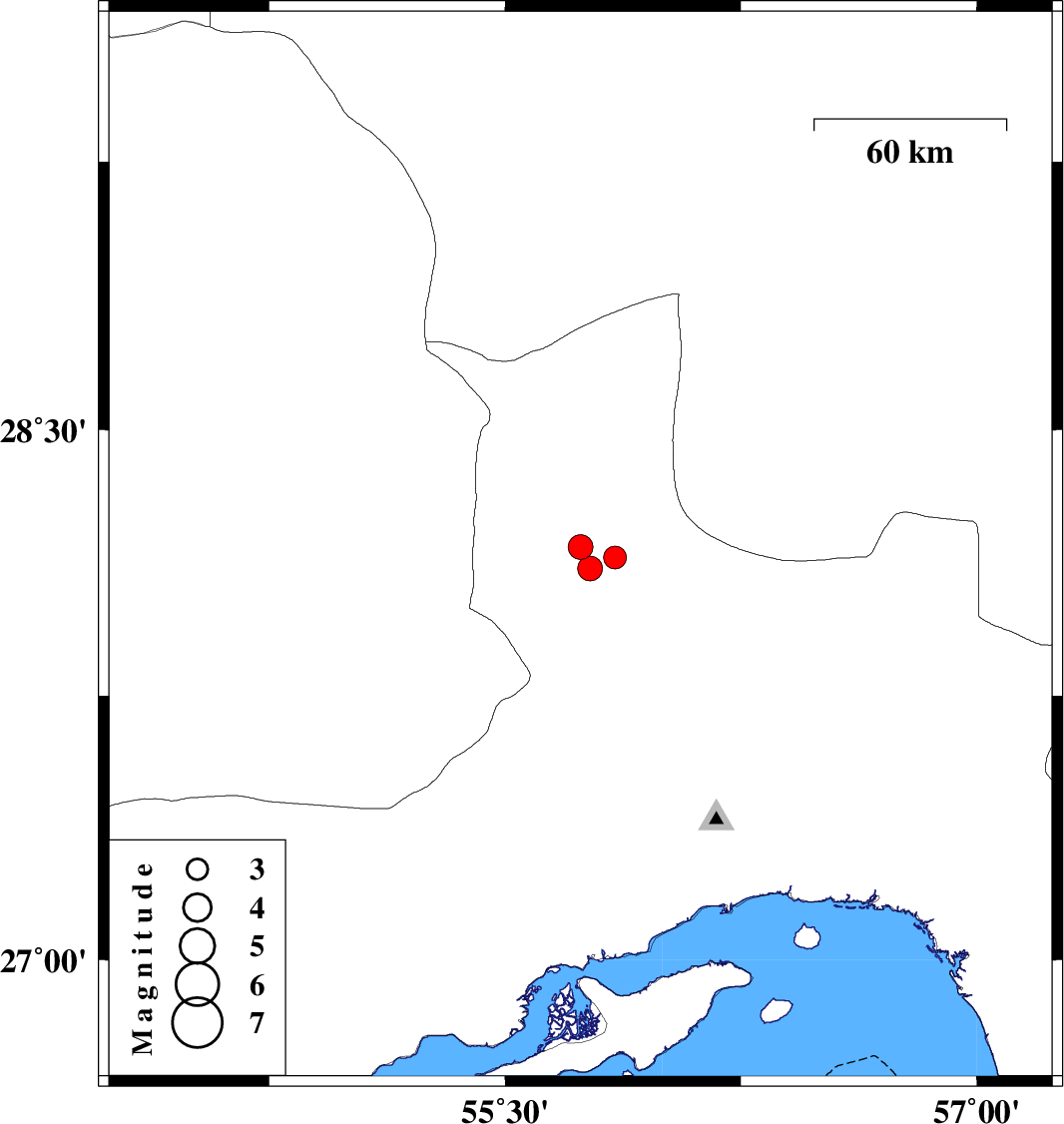 | 2012/11/06 | 21:31:29.8 | 01:01:29.8 | 28.14 | 55.85 | 15 | ML:3.2 | Hormozgan Province, 20 km South of Hajiabad | ||