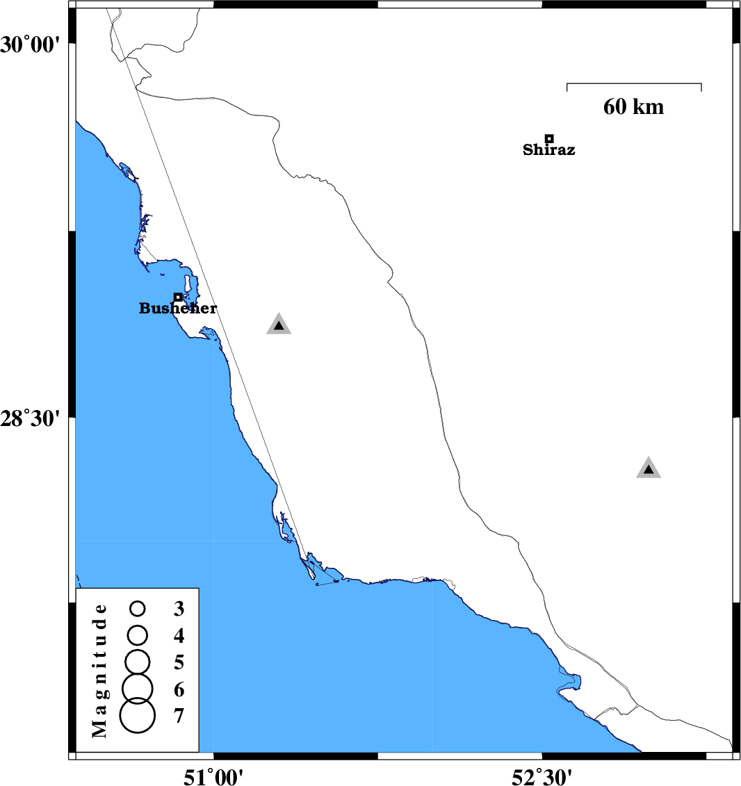 | 2012/11/10 | 01:46:16.0 | 05:16:16.0 | 28.64 | 51.87 | 28 | ML:3 | Bushehr Province, 33 km South-West of Farashband |