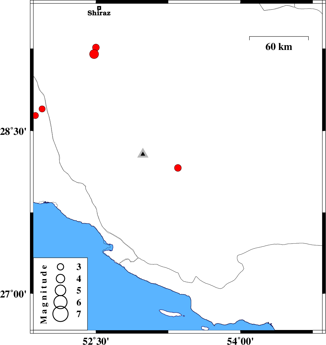 | 2012/10/19 | 01:04:05.8 | 04:34:05.8 | 29.26 | 52.5 | 41 | ML:3.3 | Fars Province, 40 km South of Shiraz |